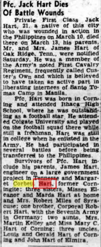 His survivors include his parents, James Hart, engineer on a large government project in Tennessee, and Margaret Corbett Hart, former Corningite; three sisters, Misses Eleanor and Marda Hart at home and Mrs. Robert Miles of Syracuse; one brother, Corporal Robert Hart with the Seventh Army in Germany.