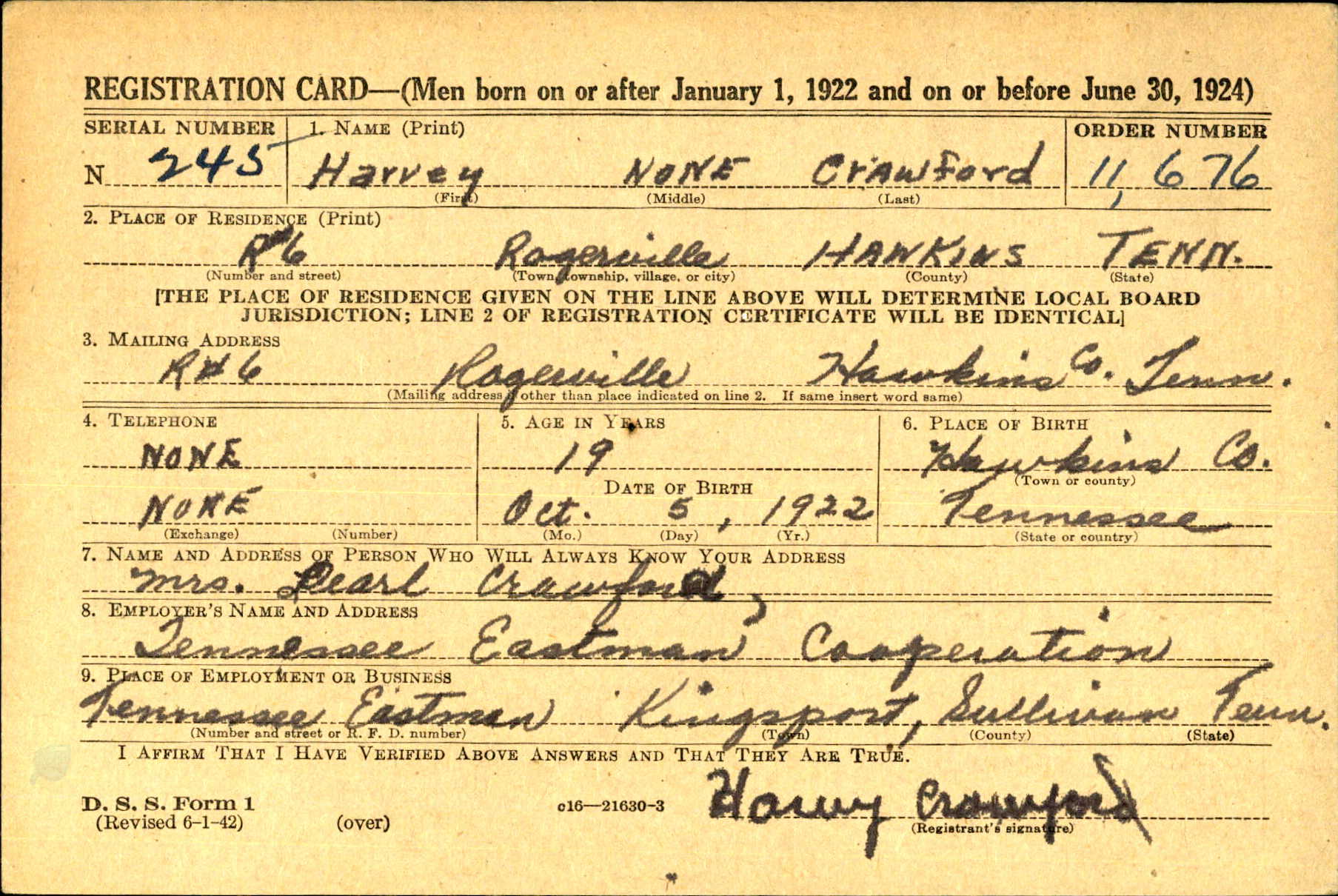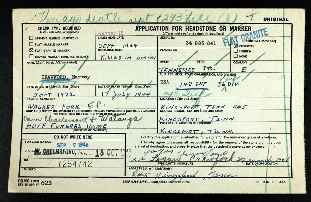 The War Department has advised Mr. and Mrs. Logan Crawford, Route 4, Rogersville, that their son, Pvt. Harvey Crawford, 22, died July 17, from wounds which he received while on a squad problem on a mortar range somewhere in Italy. A member of the infantry, Pvt. Crawford received his basic training at Camp Blanding, Fla. He had been overseas for the past five months. Prior to entering service 10 months ago, Pvt. Crawford was employed at Tennessee Eastman Corporation. Surviving are his parents; his wife, the former Miss Opal Irene Phillips, one son Kenneth Harry Crawford, Sullivan Gardens; one brother, Henry Crawford, Rogersville, and one sister, Mrs. Effie Benton, Rogersville.