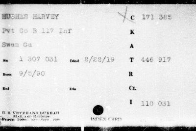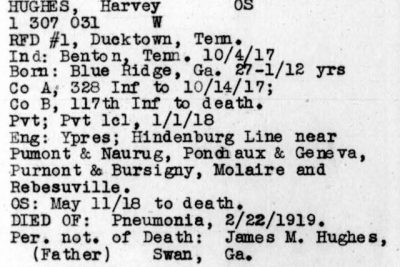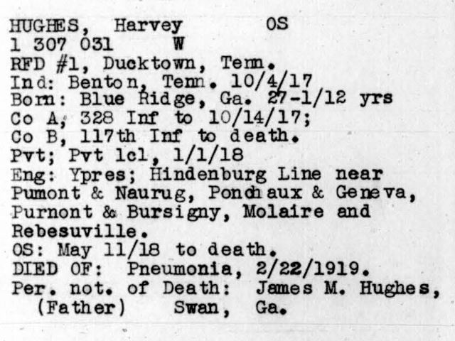 Pvt Hughes died on 22 February 1919 of pneumonia in France. He is buried at Rock Creek Cemetery, Blue Ridge, Fannin County, Georgia.