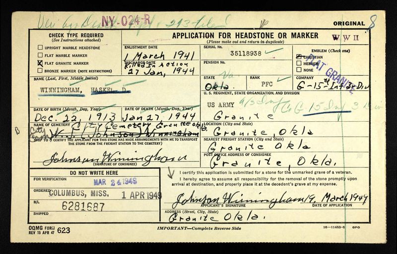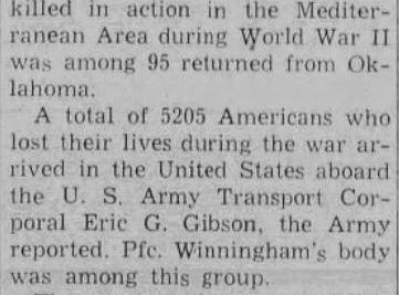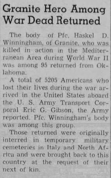 The body of Pfc. Haskel D. Winningham of Granite, who was killed in action in the Mediterranean Area during World War II was among 95 returned from Oklahoma. A total of 5205 Americans who lost their lives during the war arrived in the United States aboard the U.S. Army Transport Corporal Erie G. Gibson, the Army reported. Pfc. Winningham’s body was among this group. Those returned were originally interred in temporary military cemeteries in Italy and North Africa and were brought back to this country at the request of their next of kin.