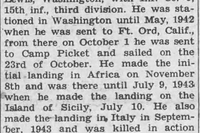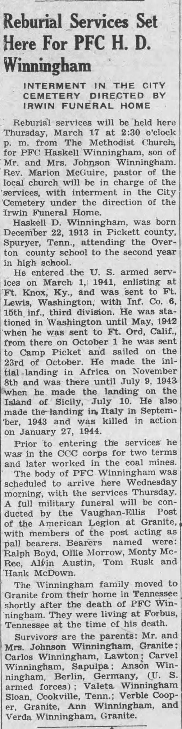 Haskell D. Winningham, was born December 22, 1913 in Pickett county, Spuryer, Tenn., attending the Overton county school to the second year in high school. He entered the U.S. armed services on March 1, 1941, enlisting at Ft. Knox, Ky., and was sent to Ft. Lewis, Washington, with Inf. Co. 6, 15th inf., third division. He was stationed in Washington until May, 1942 when he was sent to Ft. Ord, Calif., from there on October 1 he was sent to Camp Picket and sailed on the 23rd of October. He made the initial landing in Africa on November 8th and was there until July 9, 1943 when he made the landing on the Island of Sicily, July 10. He also made the landing in Italy in Septemer, 1943 and was killed in action on January 27, 1944. Prior to entering the services he was in the CCC corps for two terms and later worked in the coal mines. The body of PFC Winningham was scheduled to arrive here Wednesday morning, with the services Thursday. A full military funeral will be conducted by the Vaughan-Ellis Post of the American Legion at Granite with members of the post acting as pall bearers.