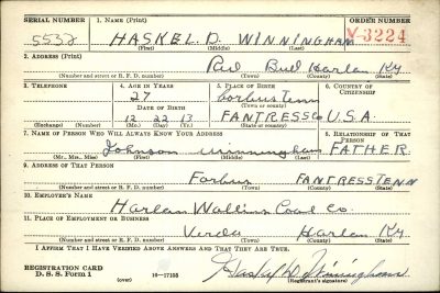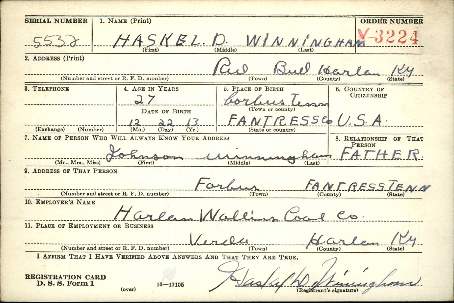 Haskel Douglas Winningham was born on 22 December 1913, Fentress County, Tennessee, the son of William Johnson Winningham and Mary Etta Robbins.
