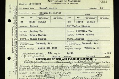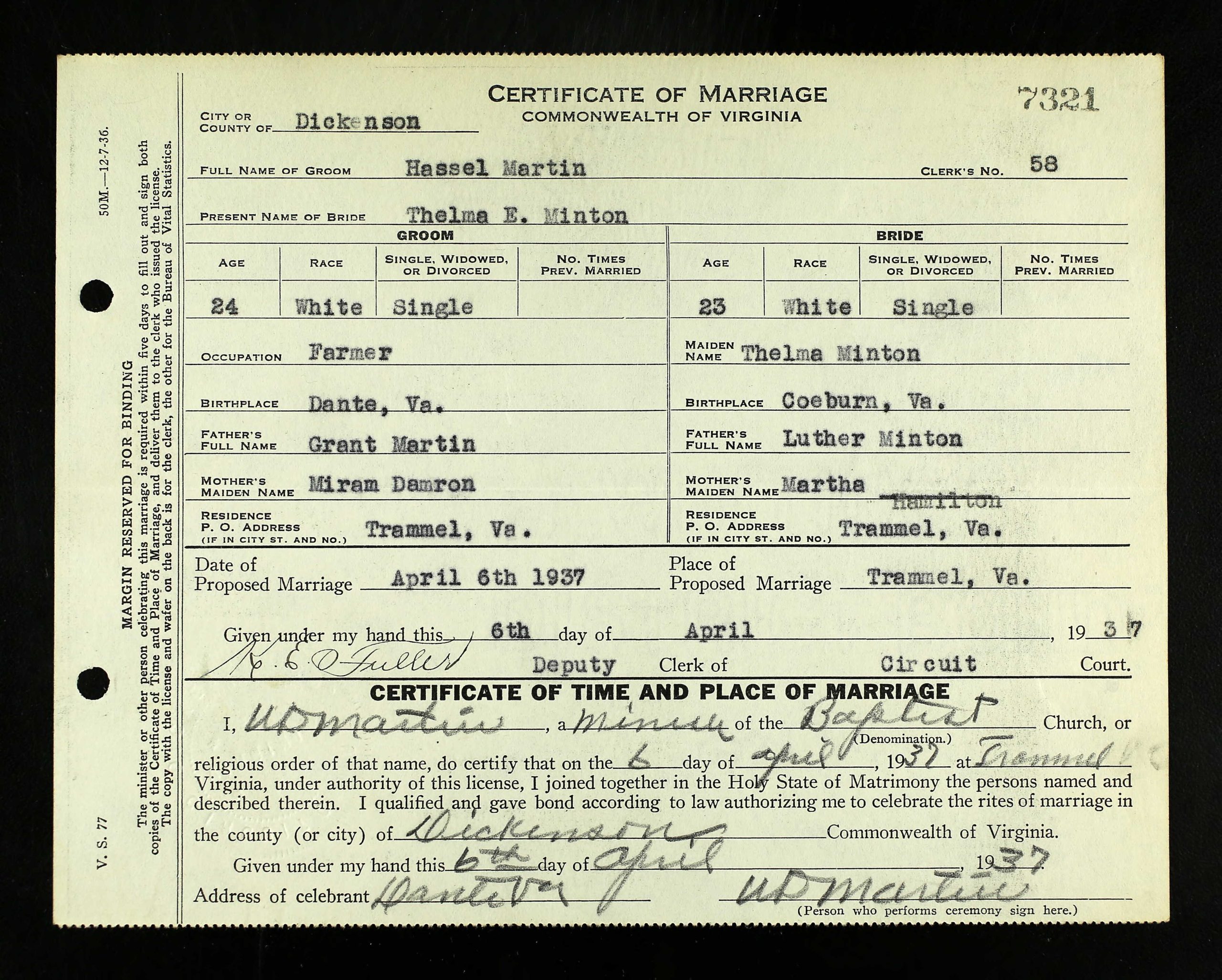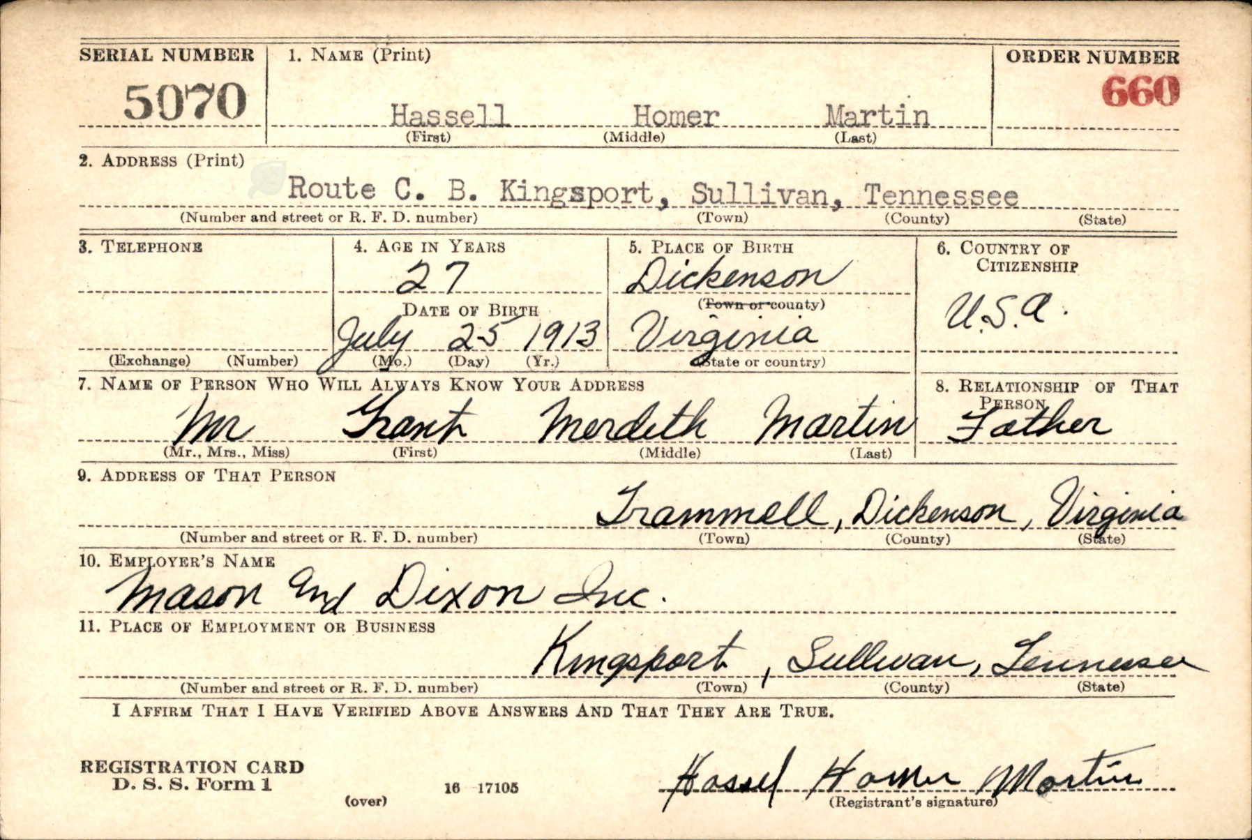 Hassell Homer Martin was born in Virginia to Meredith Grant Martin and Minta Myra (Marm) Damron. He was the husband of Thelma Minton and father of Edward Leon Martin and Barbara Ann Martin.
