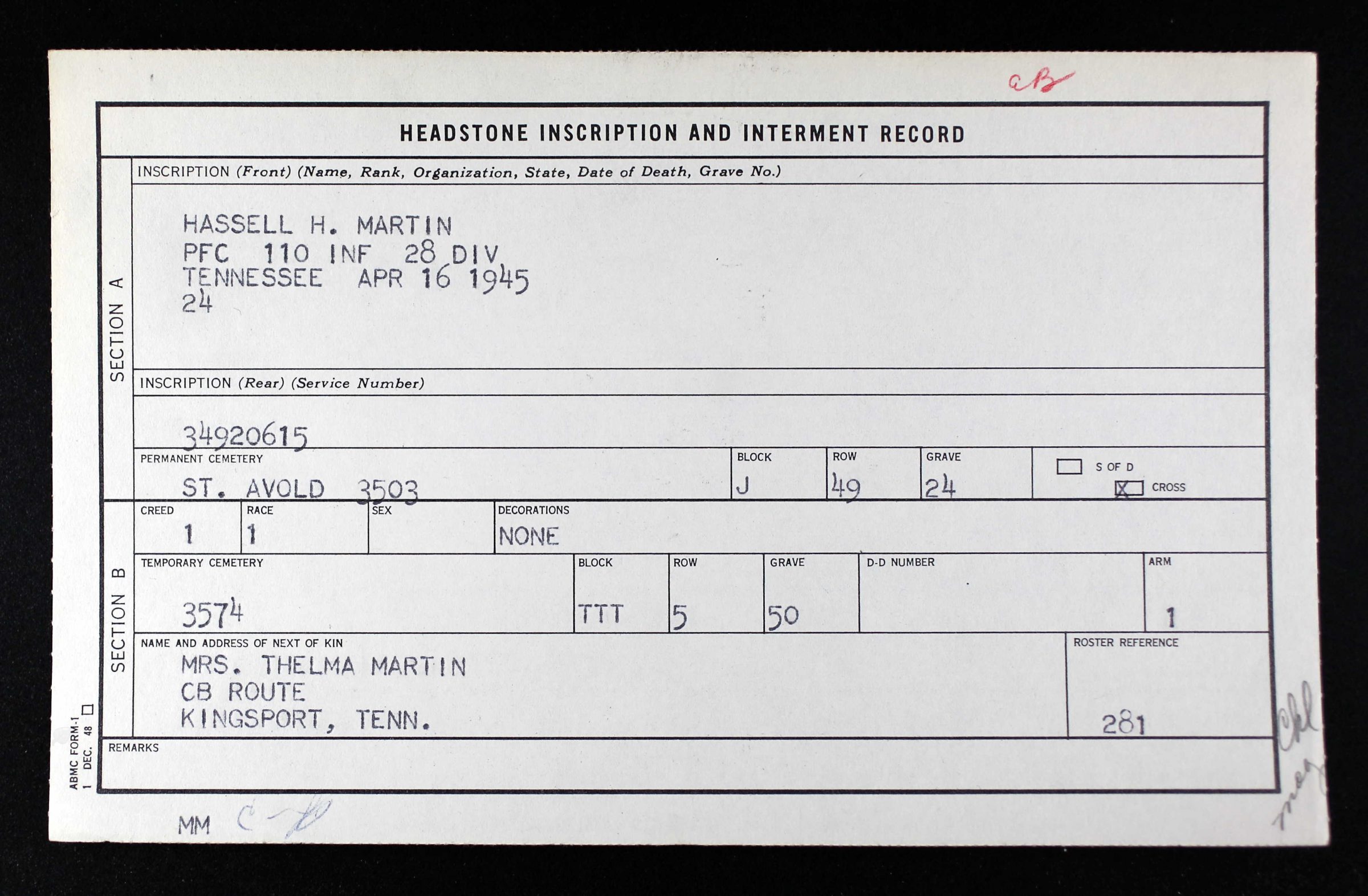 PFC Martin was captured on 20 December 1944 in Germany and died as Prisoner of war at Stalag 9B Bad Orb Hessen-Nassau, Prussia 50-09 in Germany. He is buried at Lorraine American Cemetery, St. Avold, France, J, 49, 24.