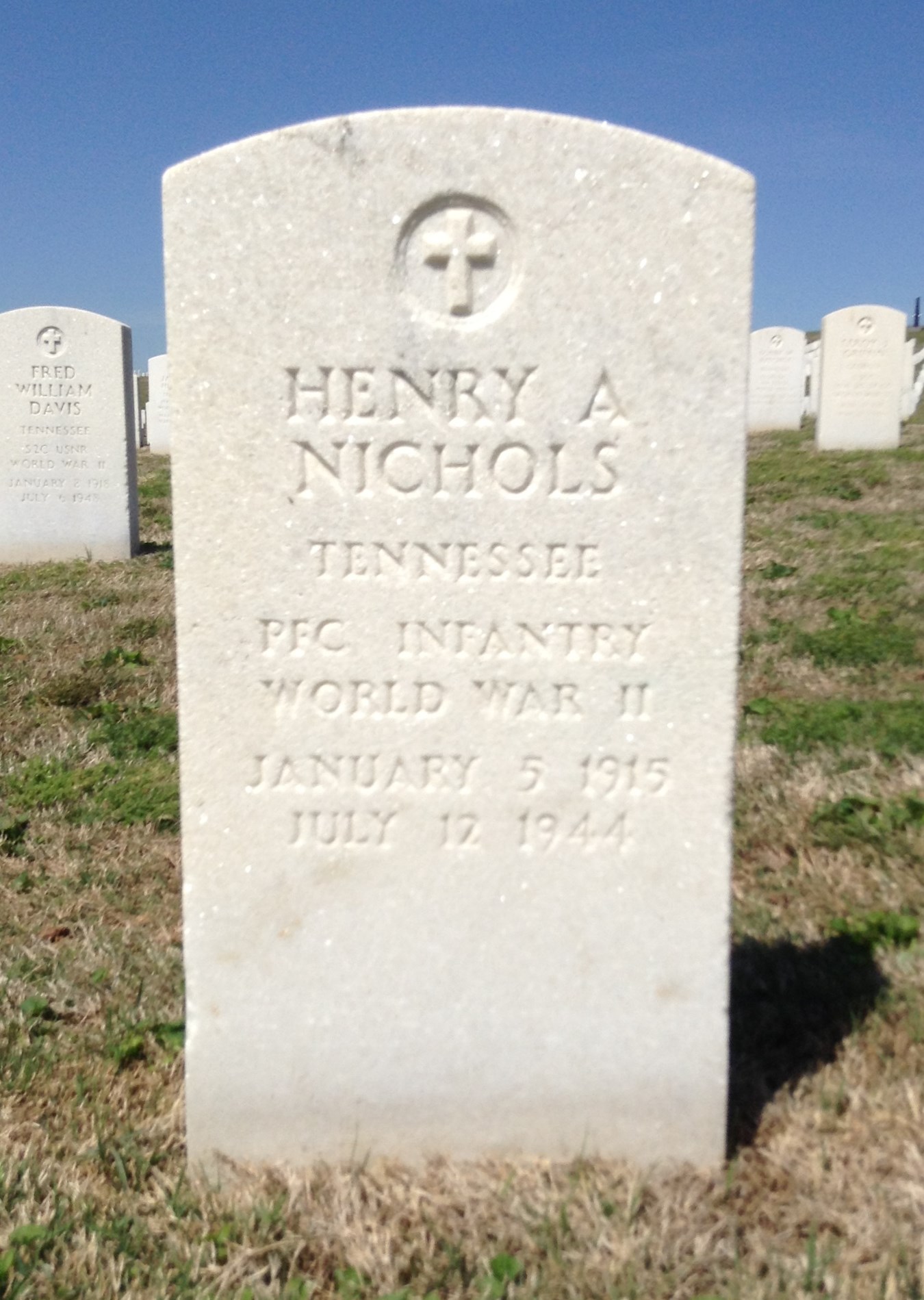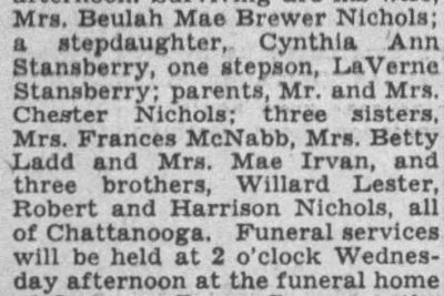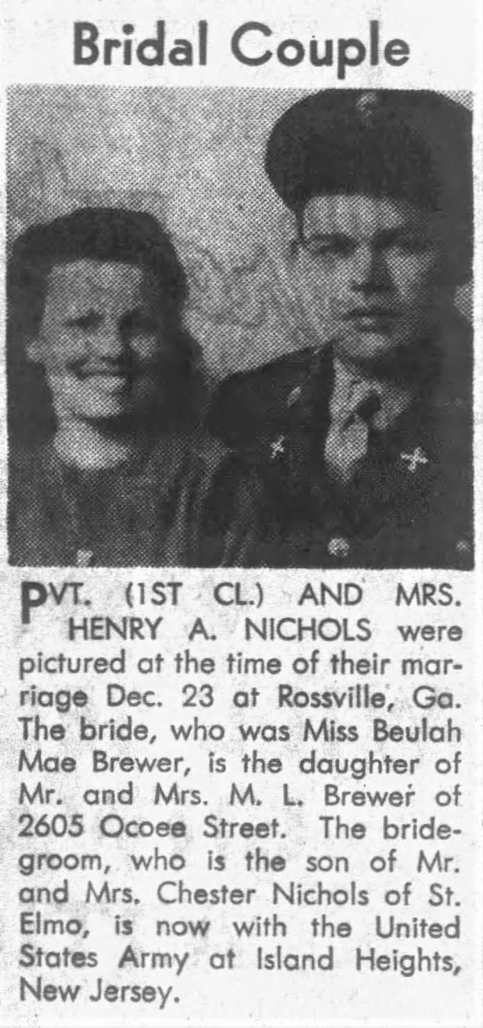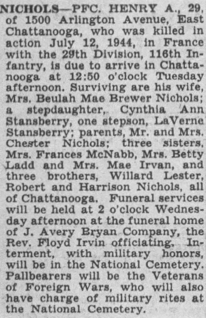 Killed was Pfc. Henry A. Nichols, whose wife is Mrs. Beulah M. Nichols, 2605 Ocoee Street, and whose paents are Mr. and Mrs. Chester Nichols, St. Elmo. He died in France on July 12. He had been overseas about three months. Three brothers, also in the service, are Pvt. Robert Nichols, T/Sgt. Harrison Nichols, Pvt Willard Nichols; three sisters, Mrs. Floyd Coulson, Mrs. Howard Ladd and Mrs. Frank Ervin of Chattanooga.