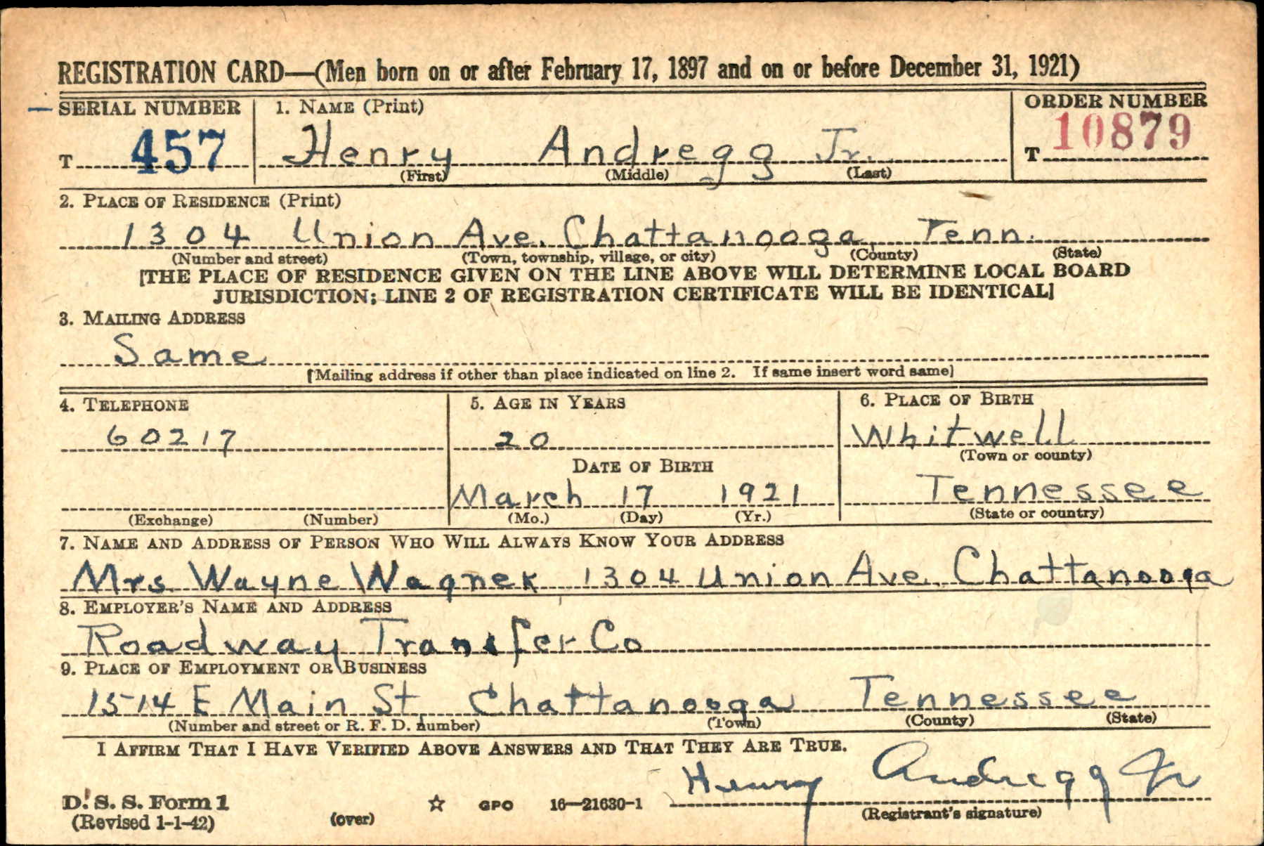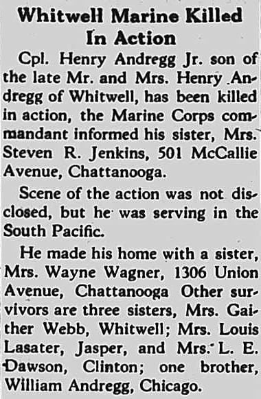 Cpl. Henry Andregg Jr., son of the late Mr. and Mrs. Henry Andregg of Whitwell, has been killed in action, the Marine Corps commandant informed his sister, Mrs. Steven R. Jenkins, 501 McCallie Avenue, Chattanooga. Scene of the action was not disclosed, but he was serving in the South Pacific. He made his home with a sister, Mrs. Wayne Wagner, 1306 Union Avenue, Chattanooga. Other survivors are three sister, Mrs. Gaither webb, Whitwell; Mrs. Louis Lasater, Jasper and Mrs. L.E. Dawson, Clinton; one brother, William Andregg, Chicago.