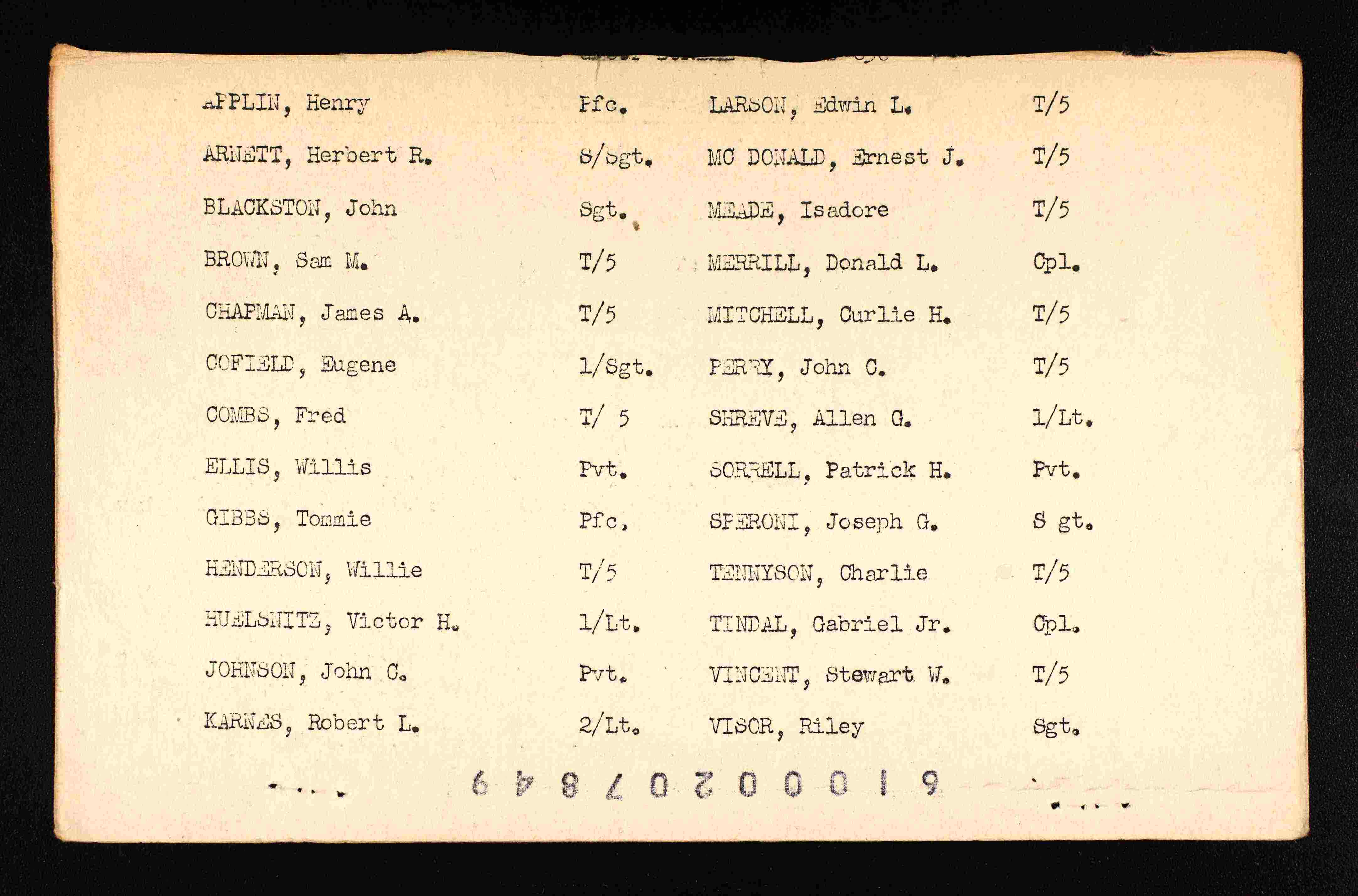 S/Sgt Herbert R. Arnett, Sgt John Blackston, T/5 Sam M. Brown, T/5 James A. Chapman, 1/Sgt Eugene Cofield, T/ Fred Combs, Pvt Willis Ellis, FPC Tommie Gibbs, T/5 Willie Henderson, 1st Lt Victor H. Huelsnitz, Pvt John C. Johnson, 2nd Lt Robert L. Karnes, T/5 Edwin L. Larson, T/5 Ernest J. Mc Donald, T/5 Isadore Meade, Cpl Donald L. Merrill, T/5 Curlie H. Mitchell, T/5 John C. Perry, 1st Lt Allen G. Shreve, Pvt Patrick H. Sorrell, Sgt John G. Speroni, T/5 Charlie Tennyson, Cpl Gabriel Tindal Jr., T/5 Stewart W. Vincent and Sgt Riley Visor.