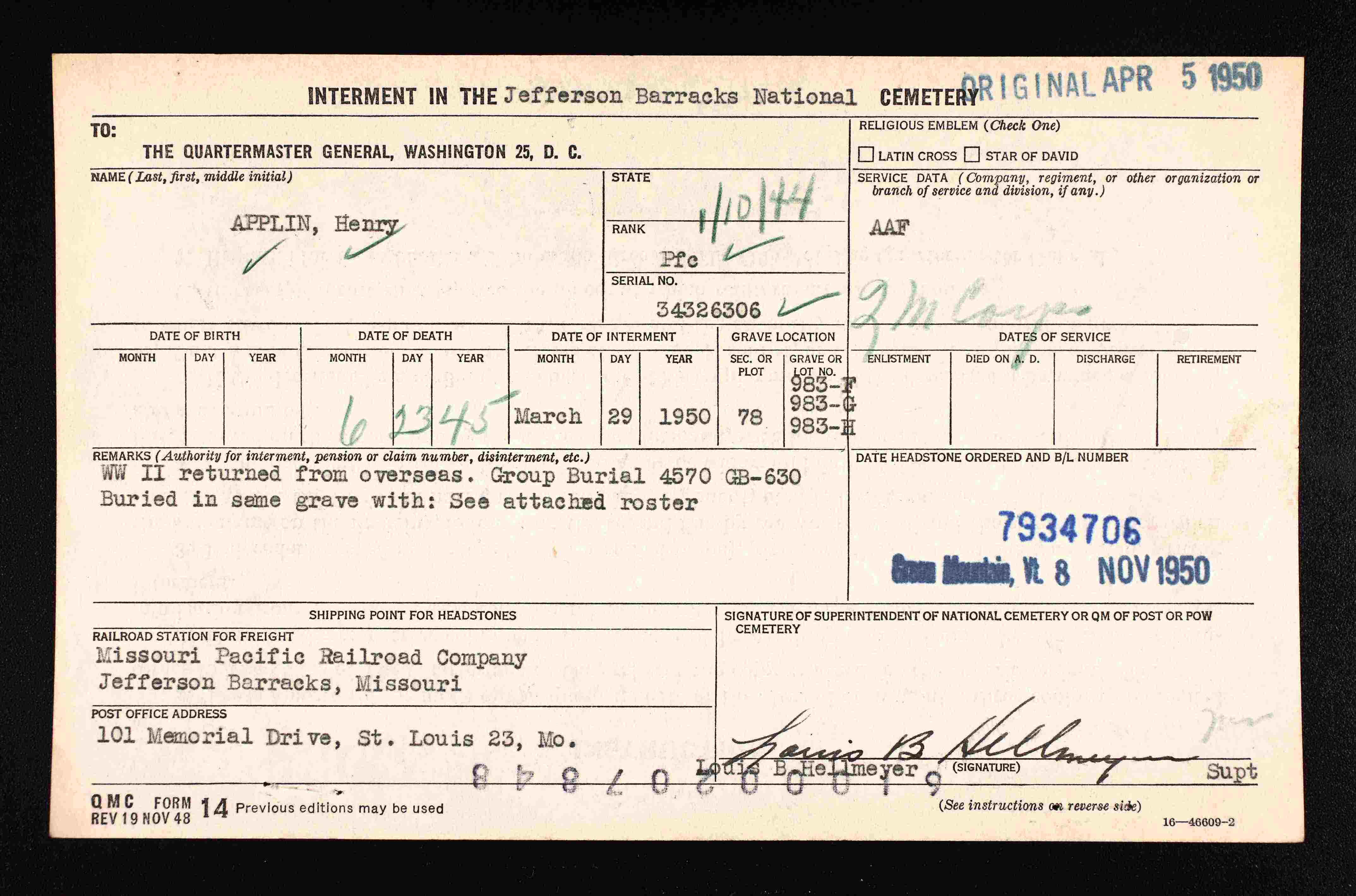 He was returned from overseas in 1950 and is buried at Jefferson Barracks National Cemetery, Saint Louis, Missouri. He is buried in the same grave with;