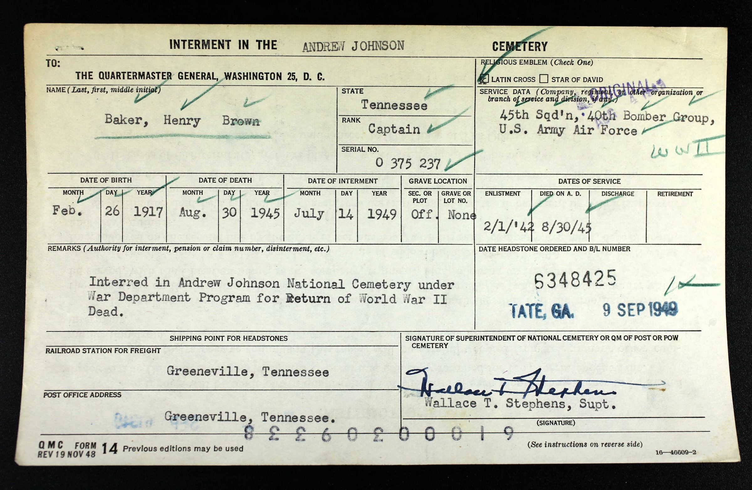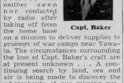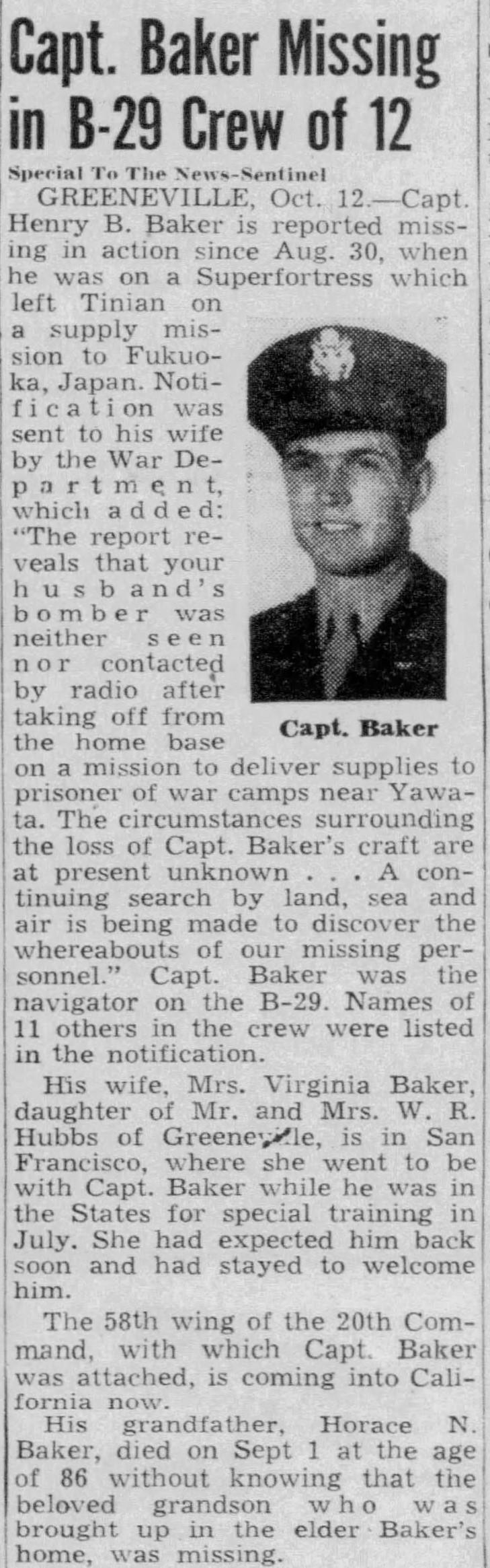 Capt. Henry B. Baker is reported missing in action since Aug. 30, when he was on a Superfortress which left Tinian on a suppy mission to Fukuoka, Japan. Notification was sent to his wife by the War Department, which added: “The report reveals that your husband’s bomber was neither seen nor contacted by radio after taking off from the home base on a mission to deliver supplies to prisoner of war camps near Yawata. The circumstances surrounding the loss of Capt. Baker’s craft are at present unknown… A continuing search by land, sea and air is being made to discover the whereabouts of our missing personnel.” Capt. Baker was the navigator on the B-29. Names of 11 others in the crew were listed in the notification. His wife, Mrs. Virginia Baker, daughter of Mr. and Mrs. W.R. Hubbs of Greeneville, is in San Francisco, where she went to be with Capt. Baker while he was in the States for special training in July. She had expected him back soon and had stayed to welcome him. The 58th wing of the 20th Command, with which Capt. Baker was attached, is coming into California now. His grandfather, Horace N. Baker, died on Sept. 1 at the age of 86 without knowing that the beloved grandson who was brought up in the elder Baker’s home, was missing.
