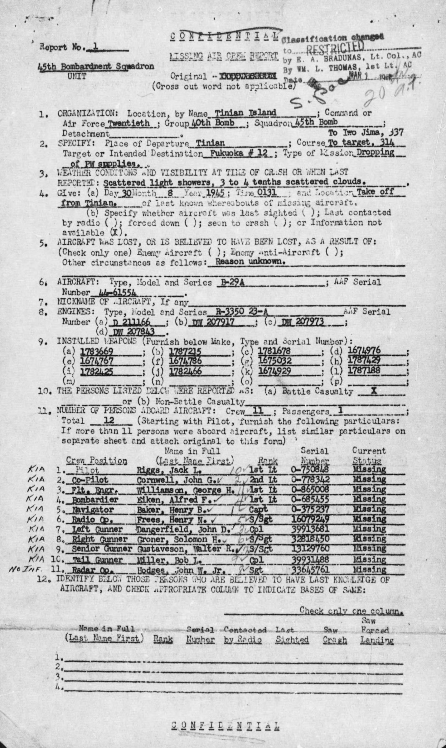 Aircraft B-29A, serial number 44-61554 departed from Tinian Island to drop Prisoner of War supplies at Fukuoka #12. In dense fog and pouring rain the B-29 attempted to cross the Sobo Mountain Range, but clipped a mountain peak and crashed, bursting into flames. The wreckage of the plane was located on the southern slope of Sobozan on boundry between Miyazaki and Oita Ken. All aboard were killed and the remains were recovered, but only 3 definitely identified; Capt Henry B. Baker, John D. Dangerfield and S/Sgt Walter R. Gustaveson.