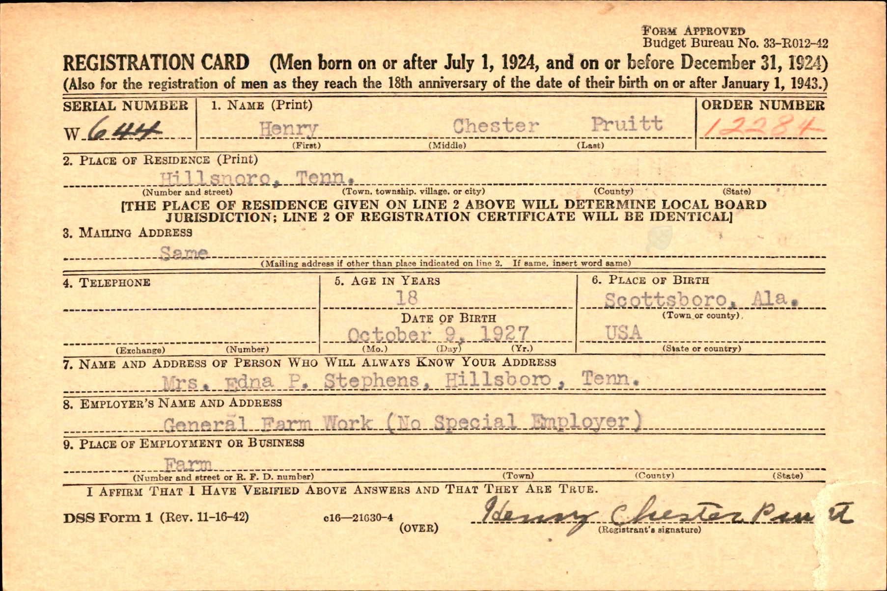 Private First Class Henry Chester Pruitt was born on October 9, 1927. He enlisted in the United States Army and served with Company D, 1st Battalion, 2nd Infantry Division. He died as a result of a vehicle accident near Naktong Bulge, Changyang, Korea, on September 20, 1950. Pfc. Pruitt was returned to his hometown of Pikeville and was buried at Rigsby Cemetery.