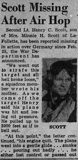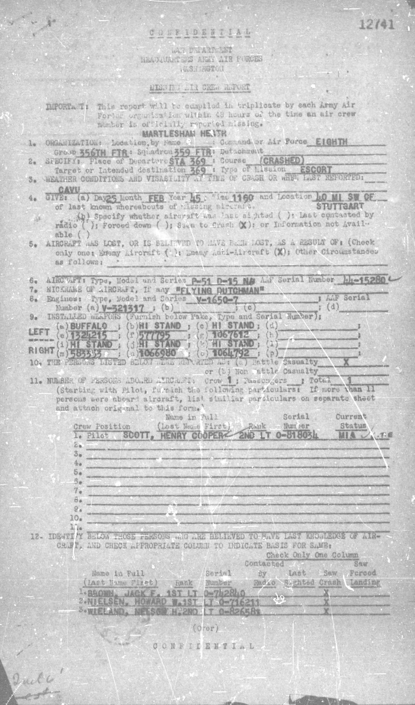 Henry Cooper Scott was the pilot of aircraft P-51 D-15 NA with serial number 44-15280, Nickname The Flying Dutchman. He was on a escort mission to Germany. He crashed 1.5 km northwest of Muehringen.