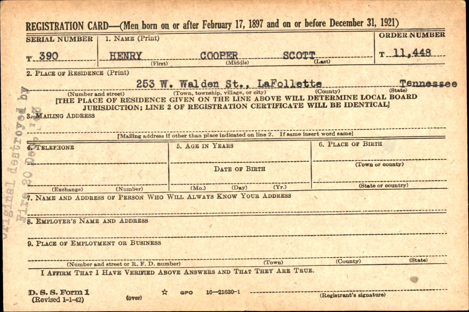 “Henry Cooper was the son of Maurice Seaman Scott and Minnie Hackney. He had two brothers and one sister. My grandfather was his older brother. Henry was the youngest. I was born in La Follette, Campbell County, Tennessee. He also is the grandson of H.T and Mollie Hackney Knoxville, Tennessee. Henry’s father worked for the L&N railroad. He lived in La Follette, Tennessee with his mother and aunt Ella Hackney.”