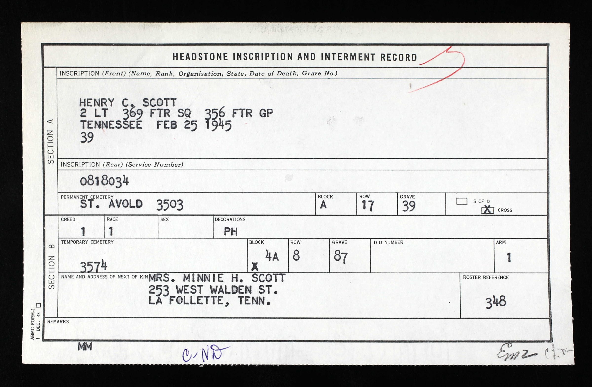 369th Fighter Squadron 356th Fighter Group 44-15280 356th FG, 359th FS OC-S lost Feb 25, 1945. MACR 12741 *** Flying Dutchman Lt. Henry C Scott KIA