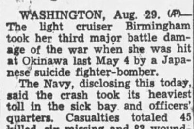 At 0840, an Oscar skimmed toward the anchorage and was splashed about 4,000 yards ahead of St Louis. At the same time, a second Oscar quickly closed at about 4,000 feet in altitude and commenced a vertical dive on Birmingham. As the aircraft was inside the elevation limit stops and cut out cams for most of her antiaircraft guns, her defensive fire was limited to 20-mm guns and they could not prevent the aircraft from plunging through the main deck to starboard. The ensuing explosion and fire wiped out sick bay and ruptured the main, second, and third decks. Bulkheads were blown in and a five-foot hole was blown in the starboard side below the waterline. Four living compartments, the armory, and three ammunition magazines were flooded before the water was contained.