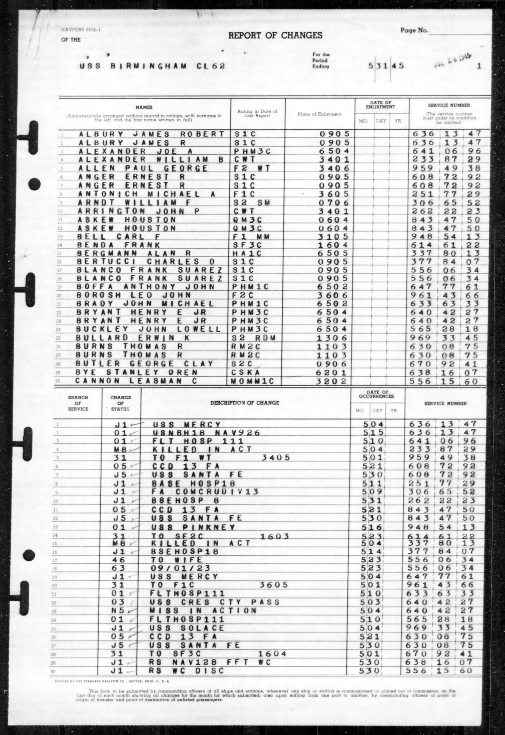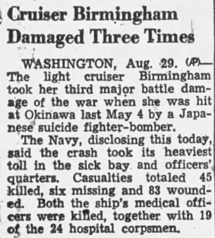He was killed and Missing in Action during battle of Okinawa. He served on the USS Birmingham who was hit by a Japanese suicide fighter-bomber on May 4, 1945.