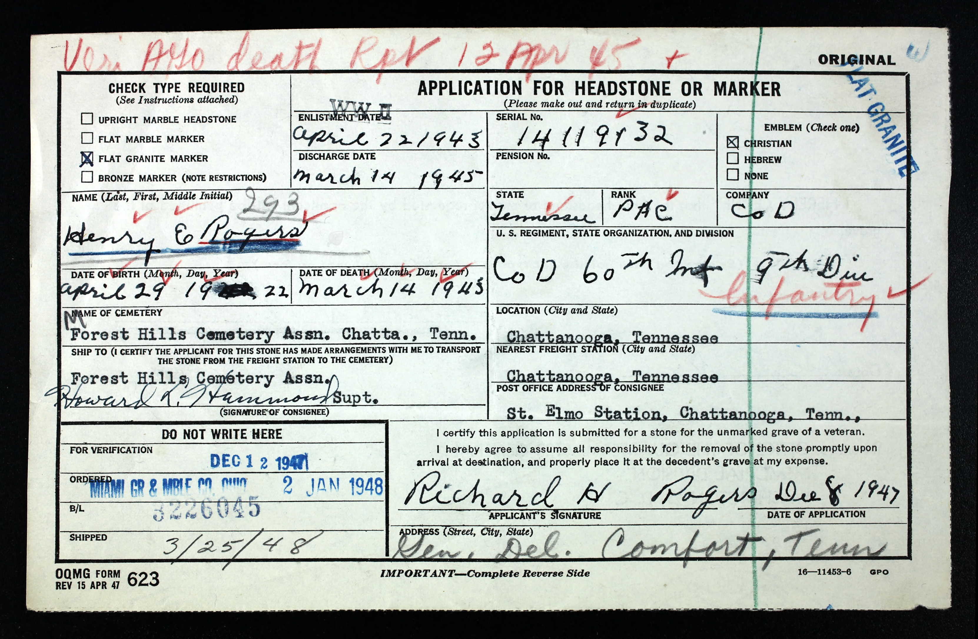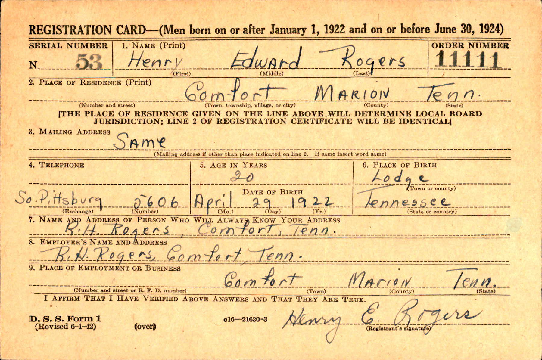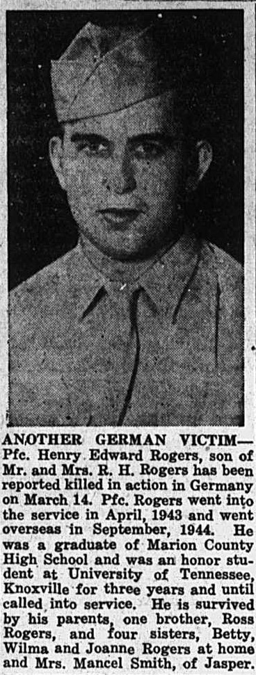 Another German Victim – Pfc. Henry Edward Rogers, son of Mr. and Mrs. R.H. Rogers has been reported killed in action in Germany on March 14. Pfc. Rogers went into the service in April, 1943 and went overseas in September, 1944. He was a graduate of Marion County High School and was an honor student at University of Tennessee, Knoxville for three years and until called into service. He is survived by his parents, one brother, Ross Rogers, and four sisters, Betty, Wilma and Joanne Rogers at home and Mrs. Mancel Smith, of Jasper.