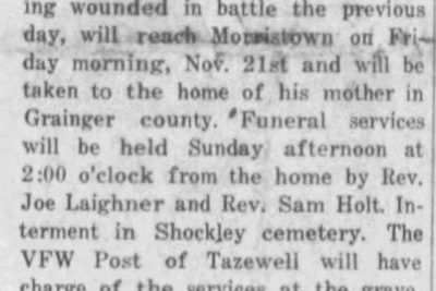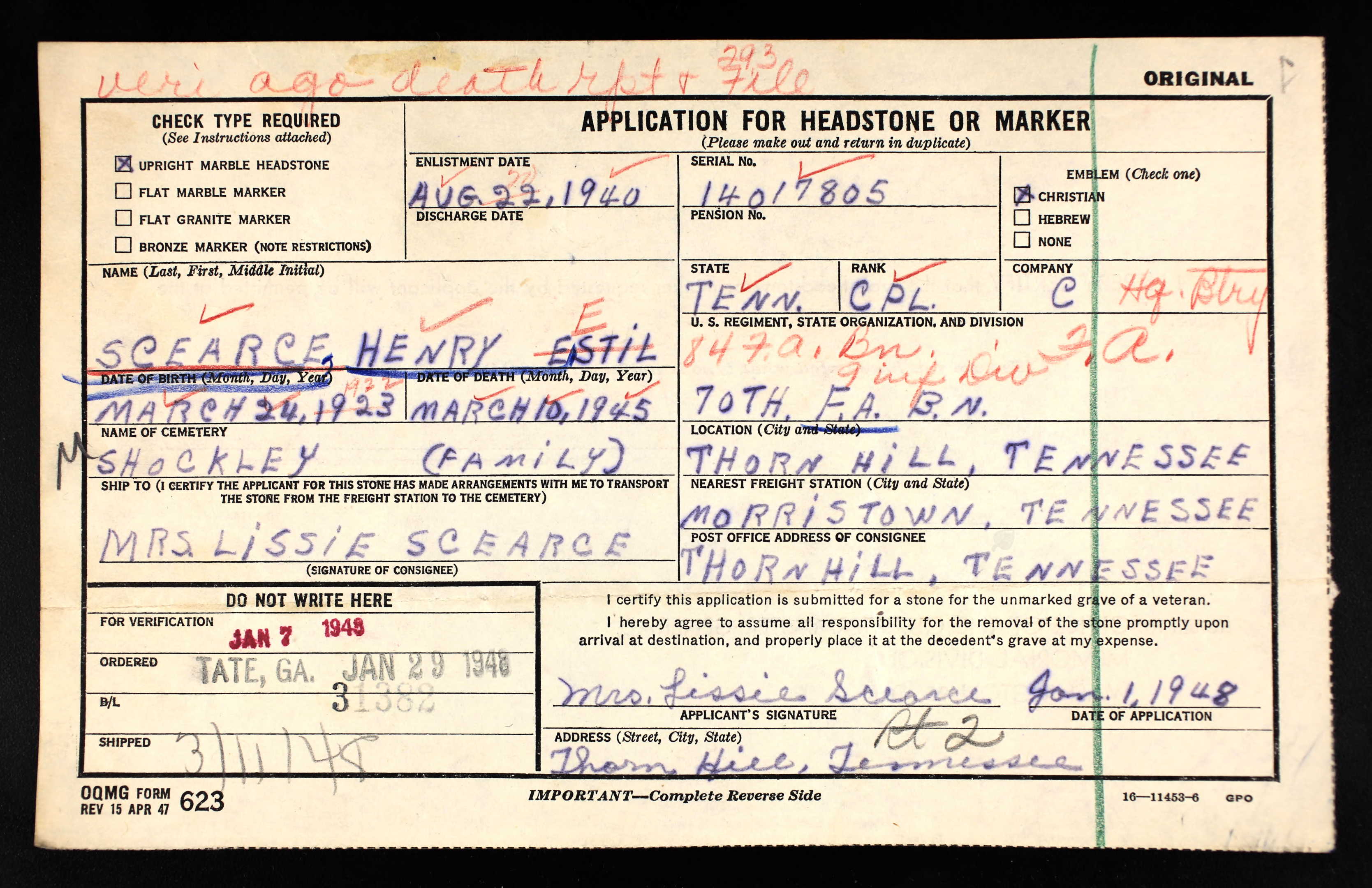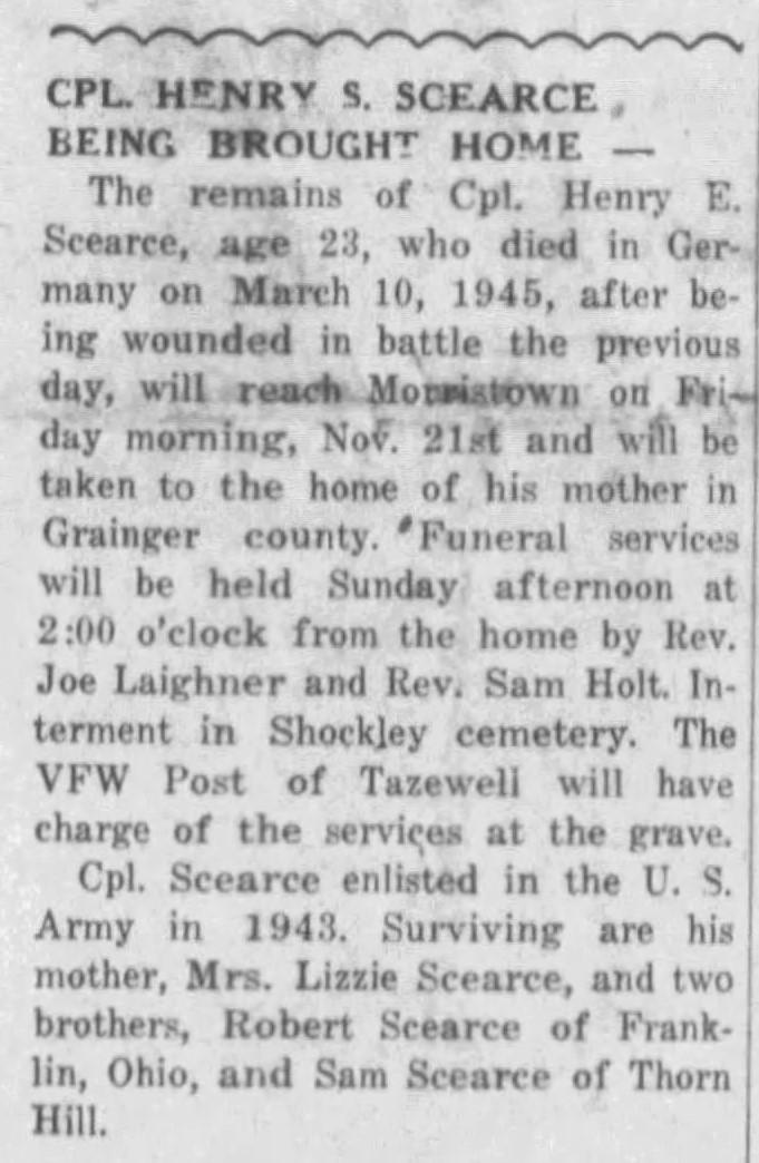 The remains of Cpl. Henry E. Scearce, age 23, who died in Germany March 10, 1945, after being wounded in battle the previous day, will reach Morristown on Friday morning, Nov. 21st and will be taken to the home of his mother in Grainger county.