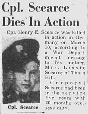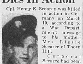 Cpl. Scearce enlisted in the U.S. Army in 1943. Surviving are his mother, Mrs. Lizzie Scearce, and two brothers, Robert Scearce of Franklin, Ohio, and Sam Scearce of Thorn Hill.