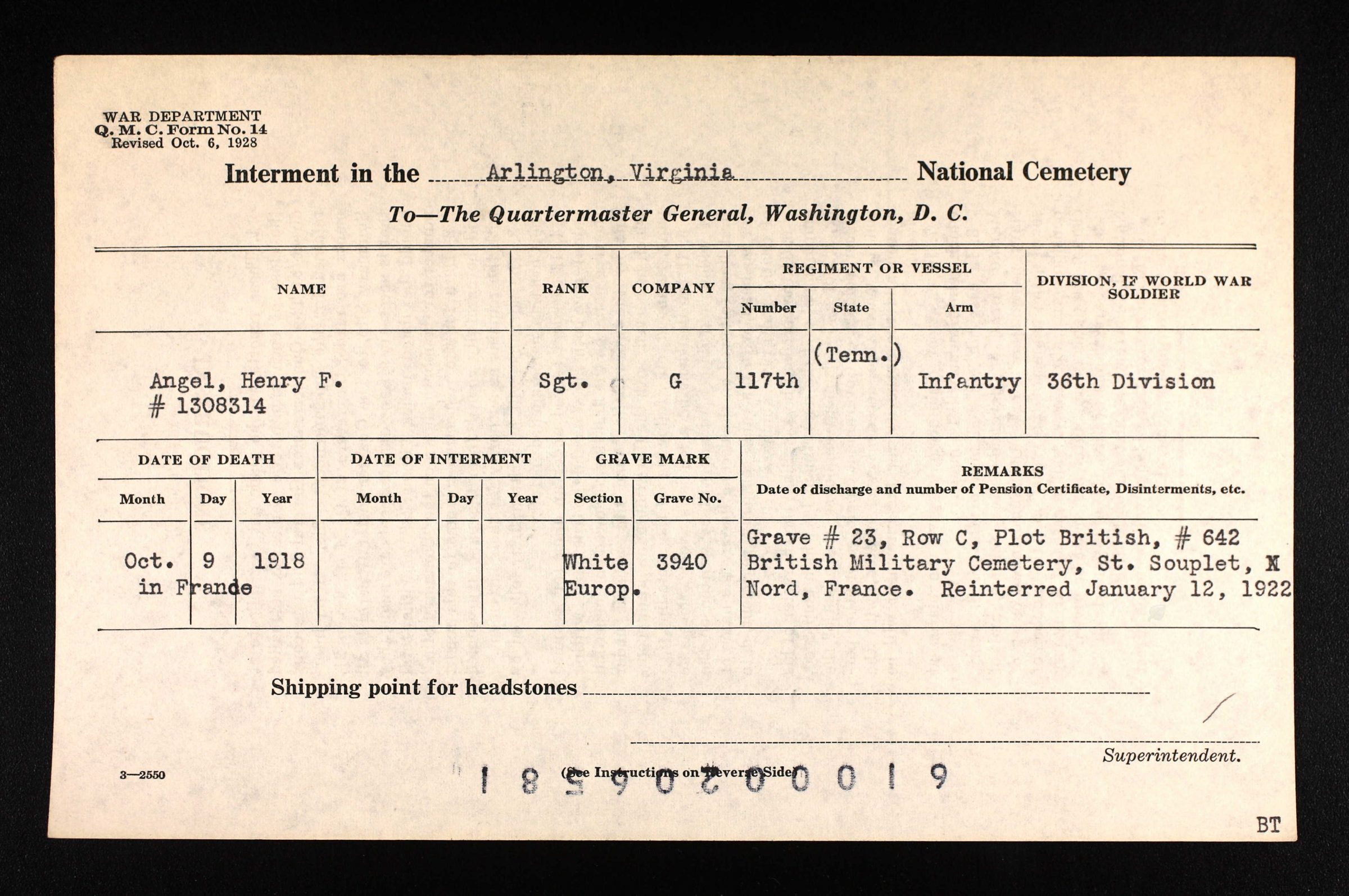 He was initially buried at the British Military Cemetery, St. Souplet, Nord, France. Buried at the Arlington National Cemetery, VA, Euro., 3940