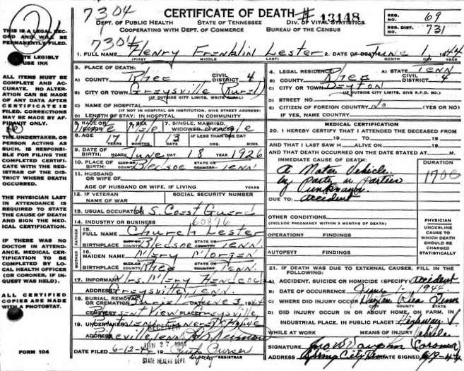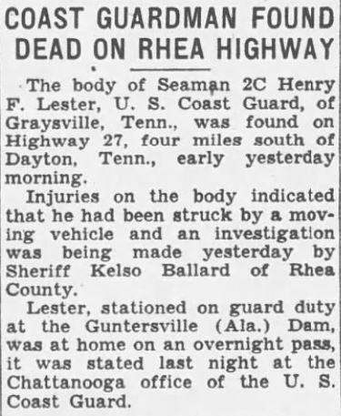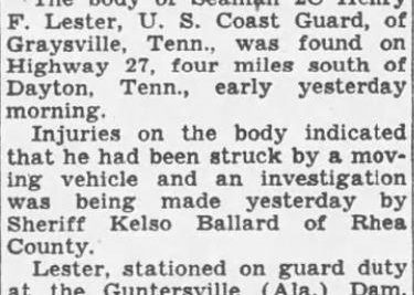 Henry Lester was killed on Dayton Highway, Rhea County, Tennessee due to a motor vehicle accident.