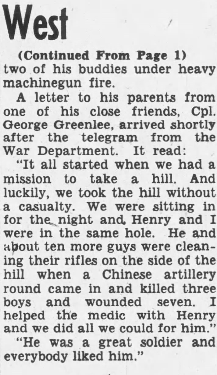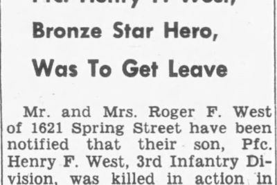 Mr. and Mrs. Roger F. West of 1621 Spring Street have been notified that their son, Pfc. Henry F. West, 3rd Infantry Division, was killed in action in Korea on July 3. In his last letter home, written June 28, West told his parents he expected to get back to the states soon on rotation leave. “I’m 11th on the list,” his letter stated, “but I don’t know when the order will come down. I think it will be down the 2nd of July. I sure hope so.”