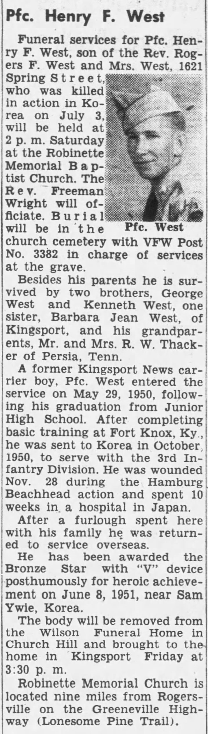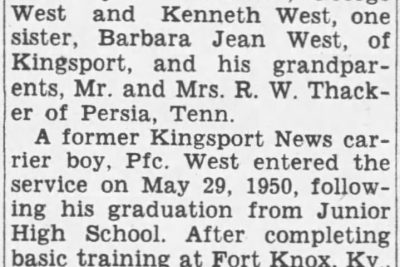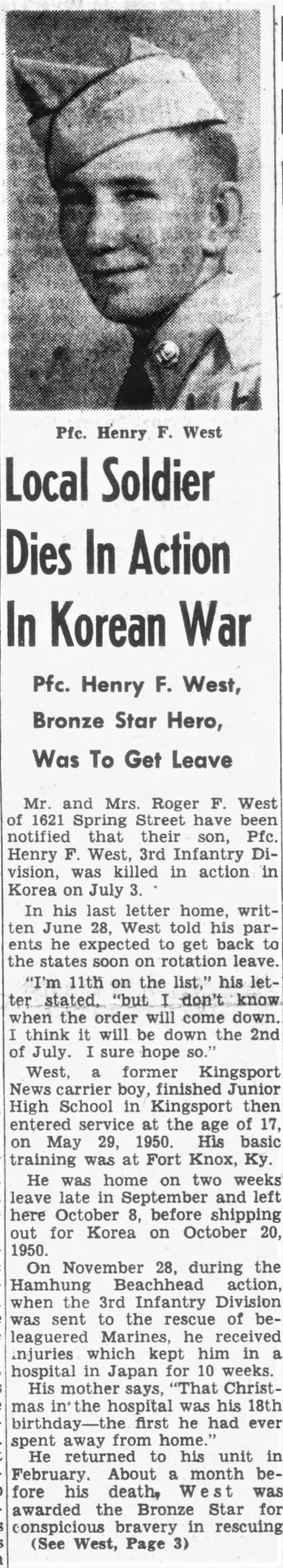 West, a former Kingsport New carrier boy, finished Junior High School in Kingsport then entered service at the age of 17, on May 29, 1950. His basic training was at Fort Knox, Ky. He was home on two weeks leave late in September and left here October 8, before shipping out of Korea on October 20, 1950. On November 28, during the Hamhung Beachhead action, when the 3rd Infantry Division was sent to the rescue of beleaguered Marines, he received injuries which kept him in a hospital in Japan for 10 weeks. His mother says, “That Christmas in the hospital was his 18th birthday – the first he had ever spent away from home.” He returned to his unit in February. About a month before his death, West was awarded the Bronze Star for conspicuous bravery in rescuing two of his buddies under heavy machinegun fire. A letter to his parents from one of his close friends, Cpl. George Greenlee, arrived shortly after the telegram from the War Department. It read: “It all started when we had a mission to take a hill. And luckily, we took the hill without a casualty. We were sitting in for the night and Henry and I were in the same hole. He and about then more guys were cleaning their rifles on the side of the hill when a Chinese artillery round came in and killed three boys and wounded seven. I helped the medic with Henry and we did all we could for him.” “He was a great soldier and everybody like him.”