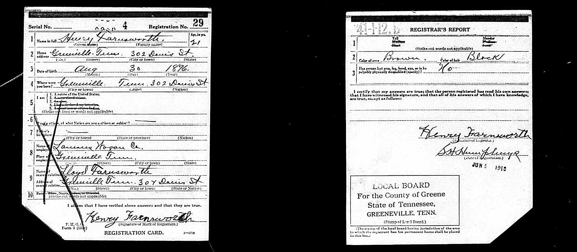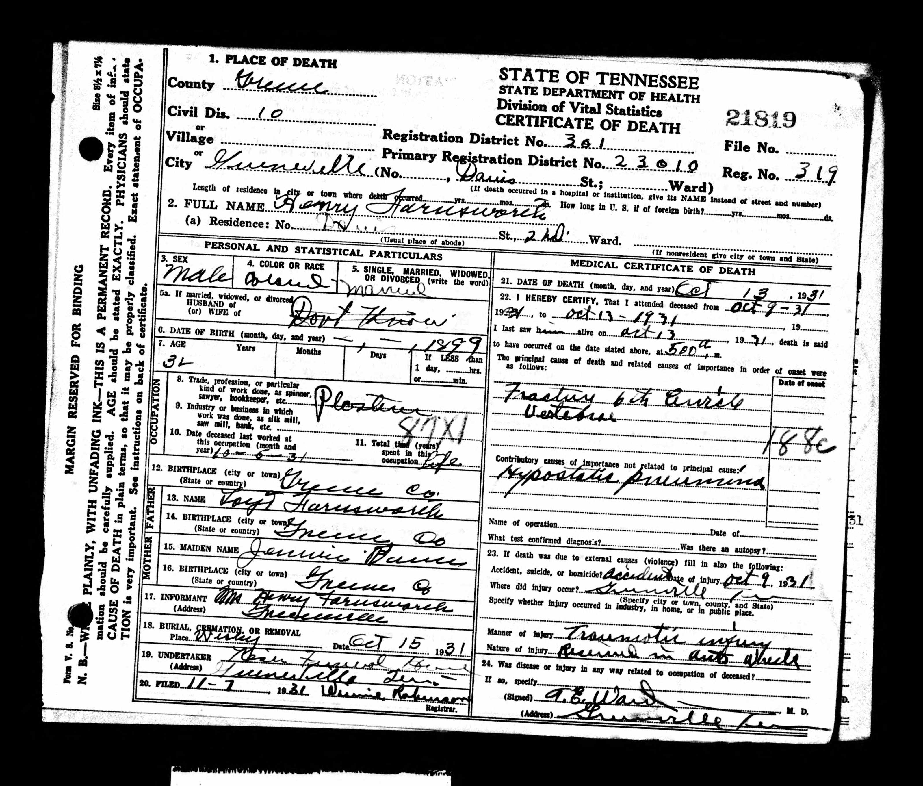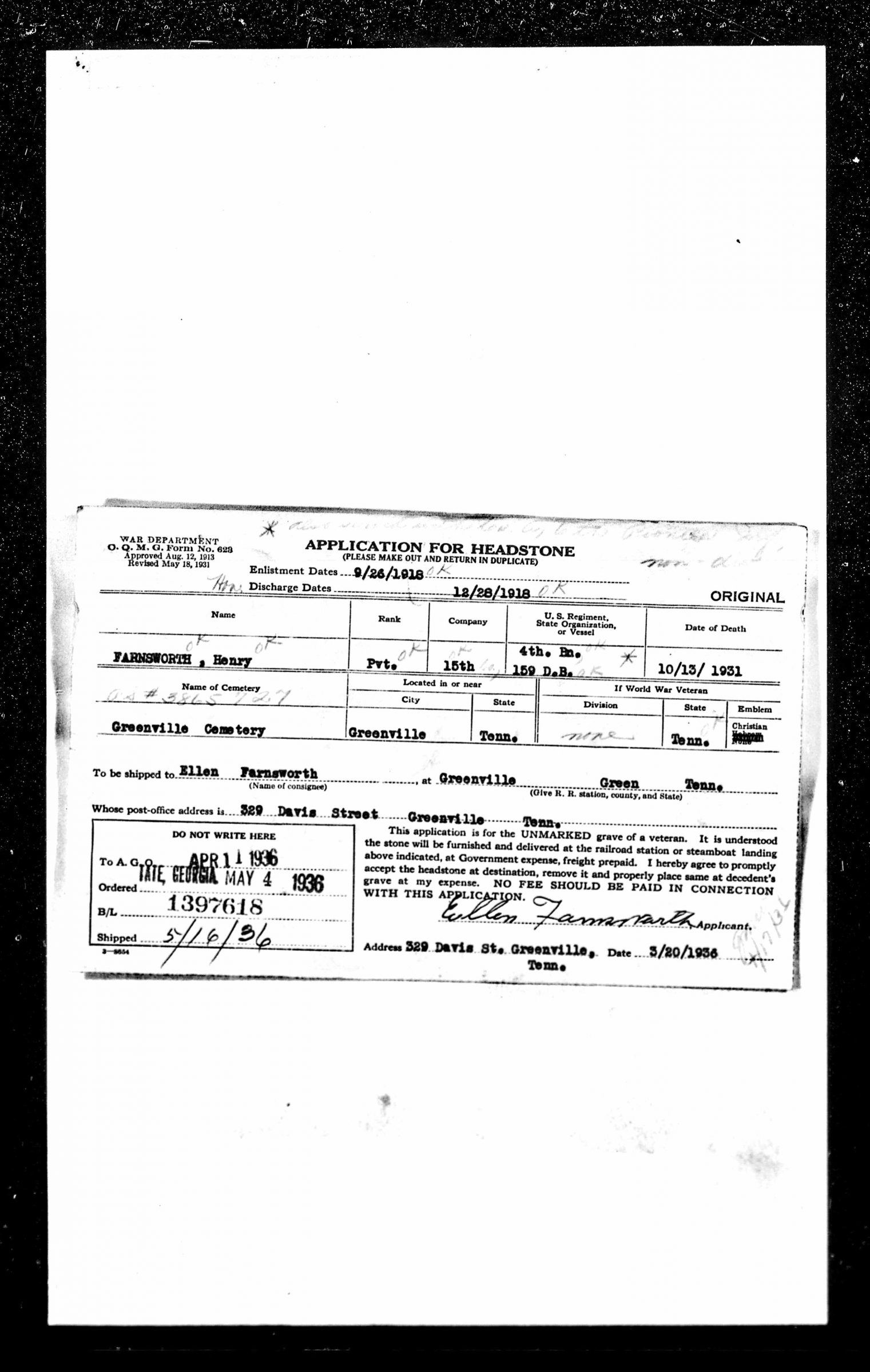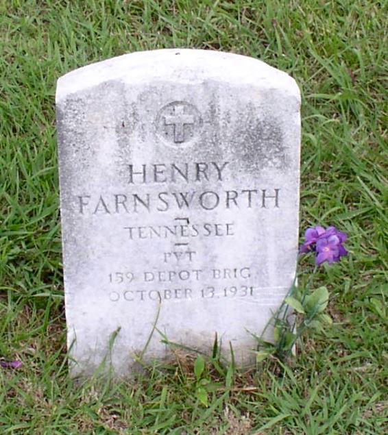 Private Farnsworth was involved in an automobile accident on 9 October 1931 and died of hypostatic pneumonia on 13 October 1931. Born 30 August 1896 in Greeneville. Son of Lloyd Farnsworth and Jennie Vance. Husband of Ellen Farnsworth.