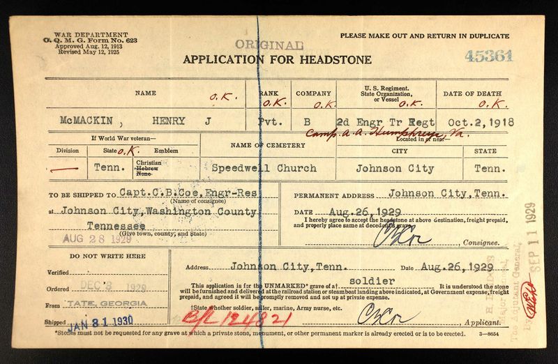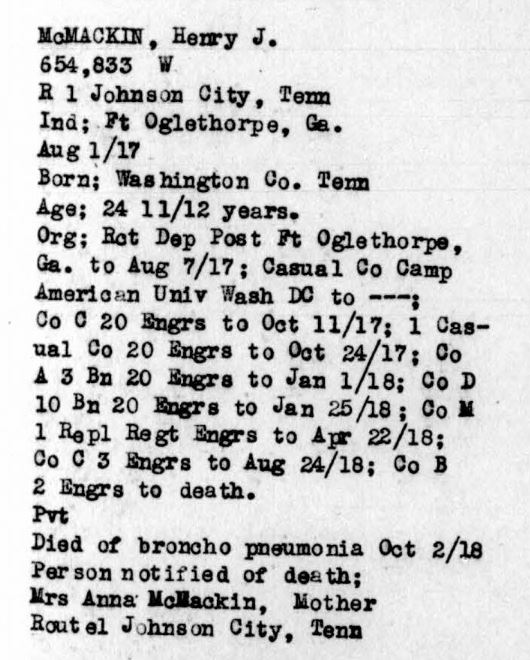 Henry J. McMackin was born in 1893 in Washington County, Tennessee to Frank McMackin and Anna E. Scott. He joined the Army at the age of 24.
