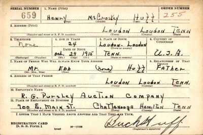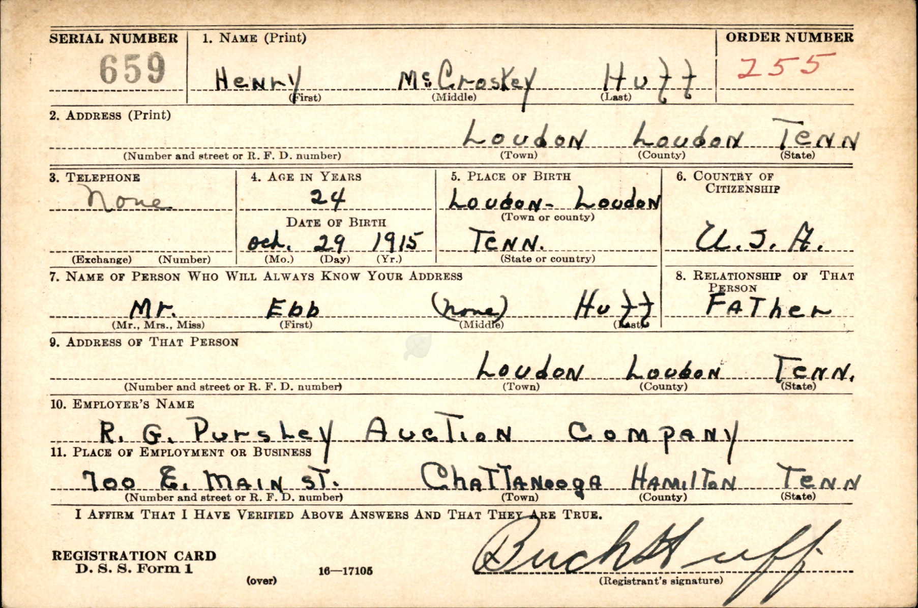 Henry Mccroskey “Buck” Huff was born 29 October 1915, Tennessee to William Ebenezer Huff and Ada Frances McCroskey. Brother of Pvt. James Robert Huff.