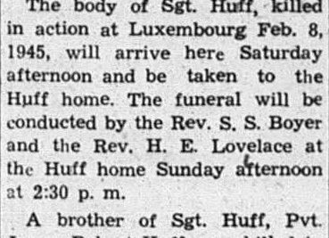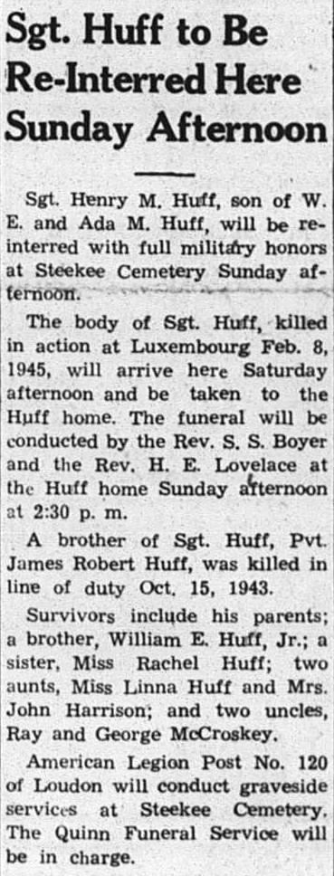 Sgt. Henry M. Huff, son of W.E. and Ada M. Huff will be re-interred with full military honors at Steekee Cemetery. The body of Sgt. Huff, killed in action at Luxembourg Feb. 8, 1945, will arrive here and be taken to the Huff home. A brother of Sgt. Huff, Pvt. James Robert Huff, was killed in line of duty Oct. 15, 1943.