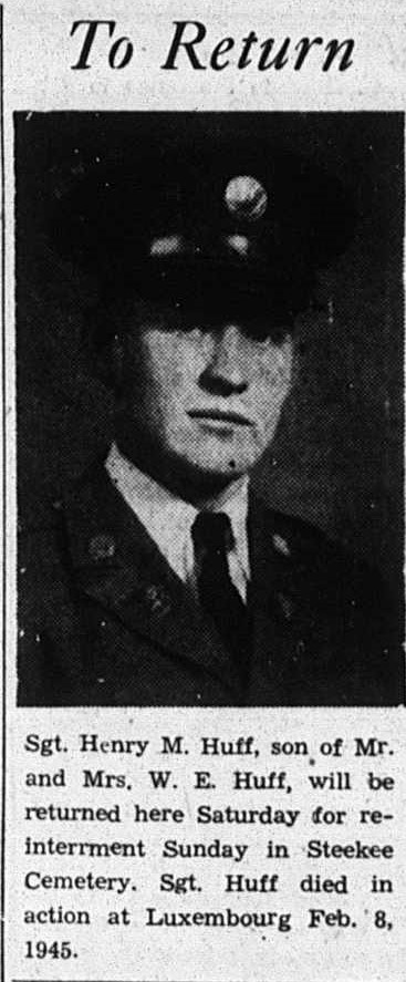 Sgt. Henry M. Huff, son of Mr. and Mrs. W.E. Huff, will be returned here Saturday for re-interment Sunday in Steekee Cemetery. Sgt. Huff died in action at Luxembourg Feb. 8, 1945.