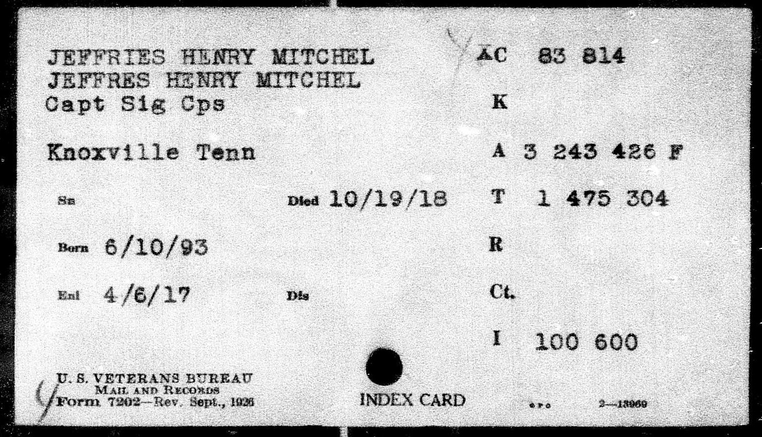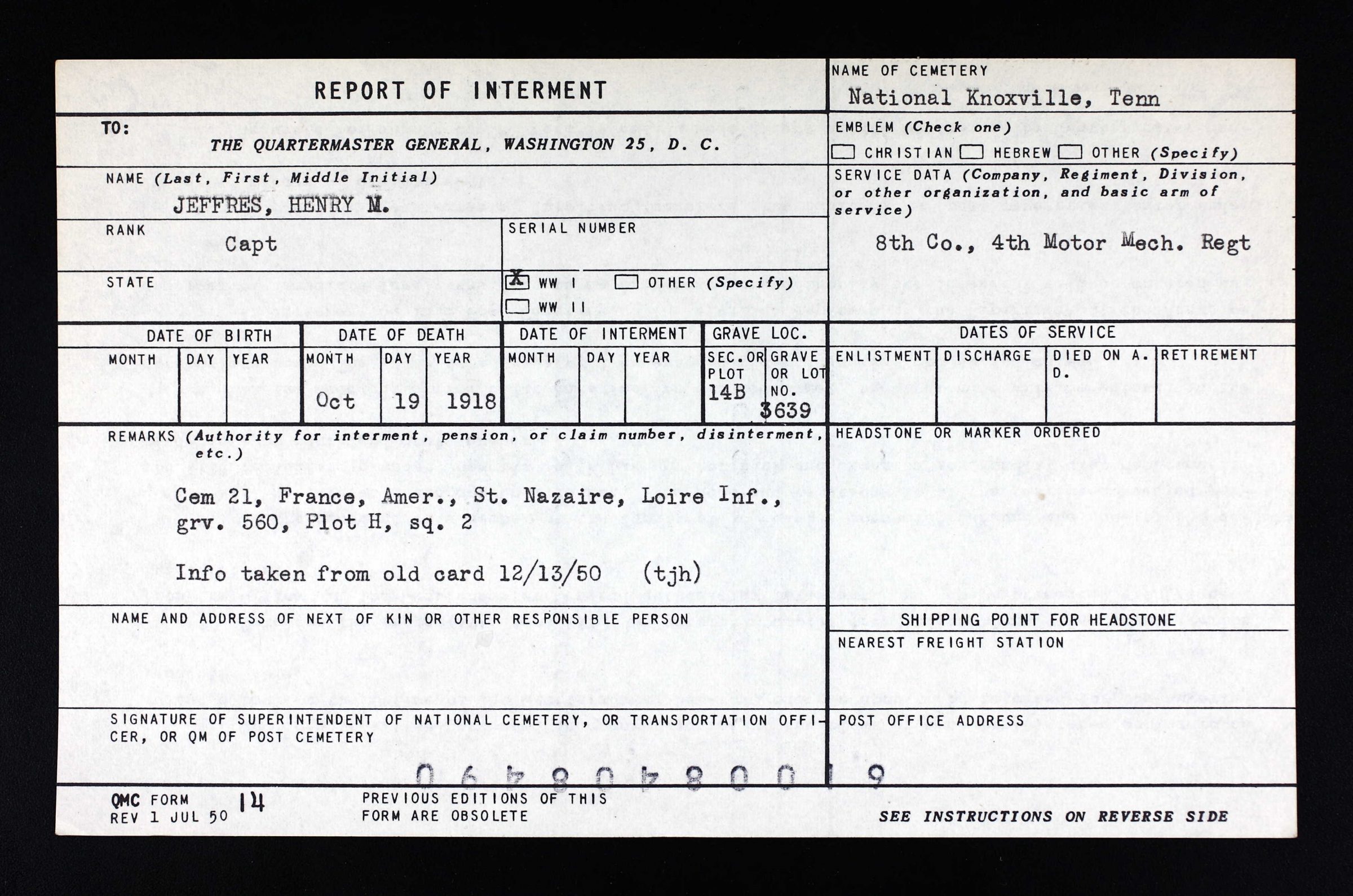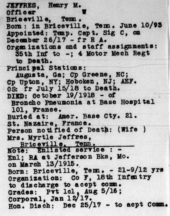 Captain Henry Mitchel Jeffres was born on June 10, 1893. Jeffres, of Lake City, Tennessee, was the son of William R. Jeffres. He lived with his grandfather, William Jeffres. Prior to joining the military, he worked as a farmer. He first enlisted in the military on January 11, 1912 at Columbus Barracks, Ohio. He joined the 20th Infantry. He was honorably discharged on January 10, 1915. During his service in World War I, he served as Captain of Company 8, 4th Motor Mechanical Regiment. He died of broncho pneumonia at Base Hospital 101 in France on October 19, 1918. He was initially buried at the American Cemetery 21, St. Nazaire in France. He is buried in Knoxville National Cemetery (Plot B, Site 3639).