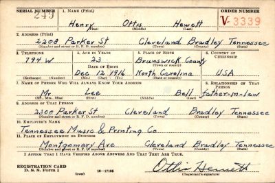 Henry Ottis Hewett was born in Brunswick County, North Carolina, the son of Austin Lockwood Hewett and Sarah Lundy Leonard. He married Frances Elva Bell in 1938 and they were the parents of Lloyd Lee Hewett and Brenda Hewett. Henry was a graduate of Burgow High School in Burgow, N.C. and Ayre’s School of Business, and Bible Training school in Cleveland. He was associated with the Tennessee Music and Printing company in Cleveland.