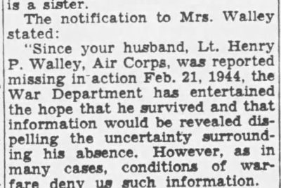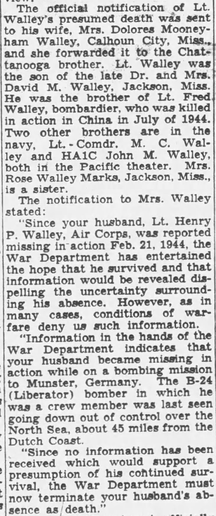 David Z. Walley, 718 Clayton Avenue, received word yesterday that his brother, Lt. Henry P. Walley, Liberator bomber co-pilot missing in action since Feb. 21, is now presumed by the War Department to be dead. The official notification of Lt. Walley’s presumed death was sent to his wife, Mrs. Dolores Mooneyham Walley, Calhoun City, Miss., and she forwarded it to the Chattanooga brother. Lt. Walley was the son of the late Dr. And Mrs. David M. Walley, Jackson, Miss. He was the brother of Lt. Fred Walley, bombardier, who was killed in action in China in July of 1944. Two other brothers are in the navy, Lt.-Comdr. M.C. Walley and HA1C John M. Walley, both in the Pacific theater. Mrs. Rose Walley Marks, Jackson, Miss., is a sister.
