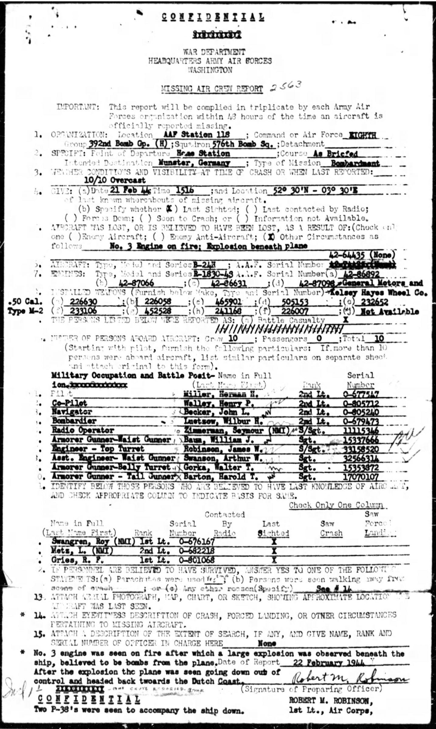 The notification to Mrs. Walley stated: “Since your husband, Lt. Henry P. Walley, Air Corps, was reported missing in action Feb. 21, 1944, the War Department has entertained the hope that he survived and that information would be revealed dispelling the uncertainty surrounding his absence. However, as in many cases, conditions of warfare deny us such information. Information in the hands of the War Department indicates that your husband became missing in action while on a bombing mission to Munster, Germany. The B-24 (Liberator) bomber in which he was a crew member was last seen going down out of control over the North Sea, about miles from the Dutch Coast. Since no information has been received which would support a presumption of his continued survival, the War Department must now terminate your husband’s absence as death.”