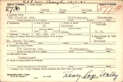 Henry Page Walley was born in Richton, Mississippi to David Walley and Rose Alpert. His father was a Major in the United States Army during World War I and died in 1929. He was a graduate of Central High School, Jackson, Mississippi in He was married to Glenda D. Walley. His brother 2nd Lt. Fred J. Walley was killed in an airplane crash in China in 1944.