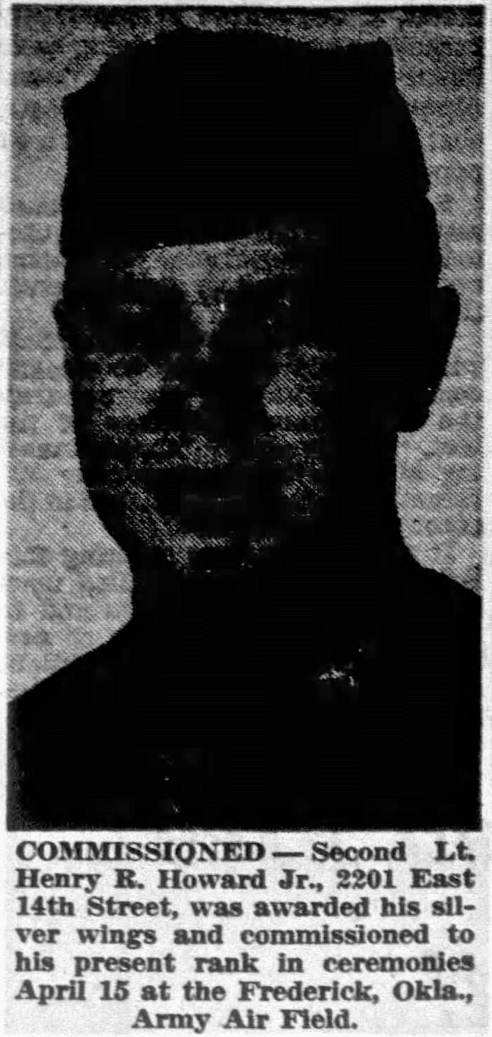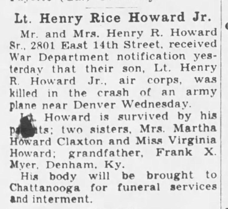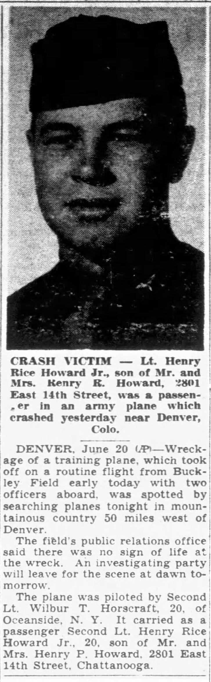 Mr. and Mrs. Henry R. Howard Sr., 2801 East 14th Street, received War Department notification yesterday that their son, Lt. Henry R. Howard Jr., air corps, was killed in the crash of an army plane near Denver Wednesday. The plane was piloted by Second Lt. Wilbur . Horscraft, 20, of Odeanside, N.Y. It carried as a passenger Second Lt. Henry Rice Jr.