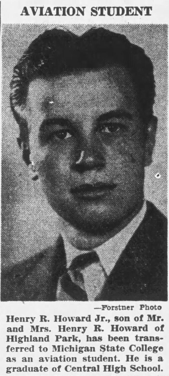 Henry Rice Howard was the son of Henry Rice Howard and Mary Catherine Myer. Henry Howard was transferred to Michigan State College as an aviation student in 1943. He was a graduate of Central High School. He was awarded his silver wings and commissioned to Second Lieutenant on April 15, 1945 at the Frederick, Okla., Army Air Field.