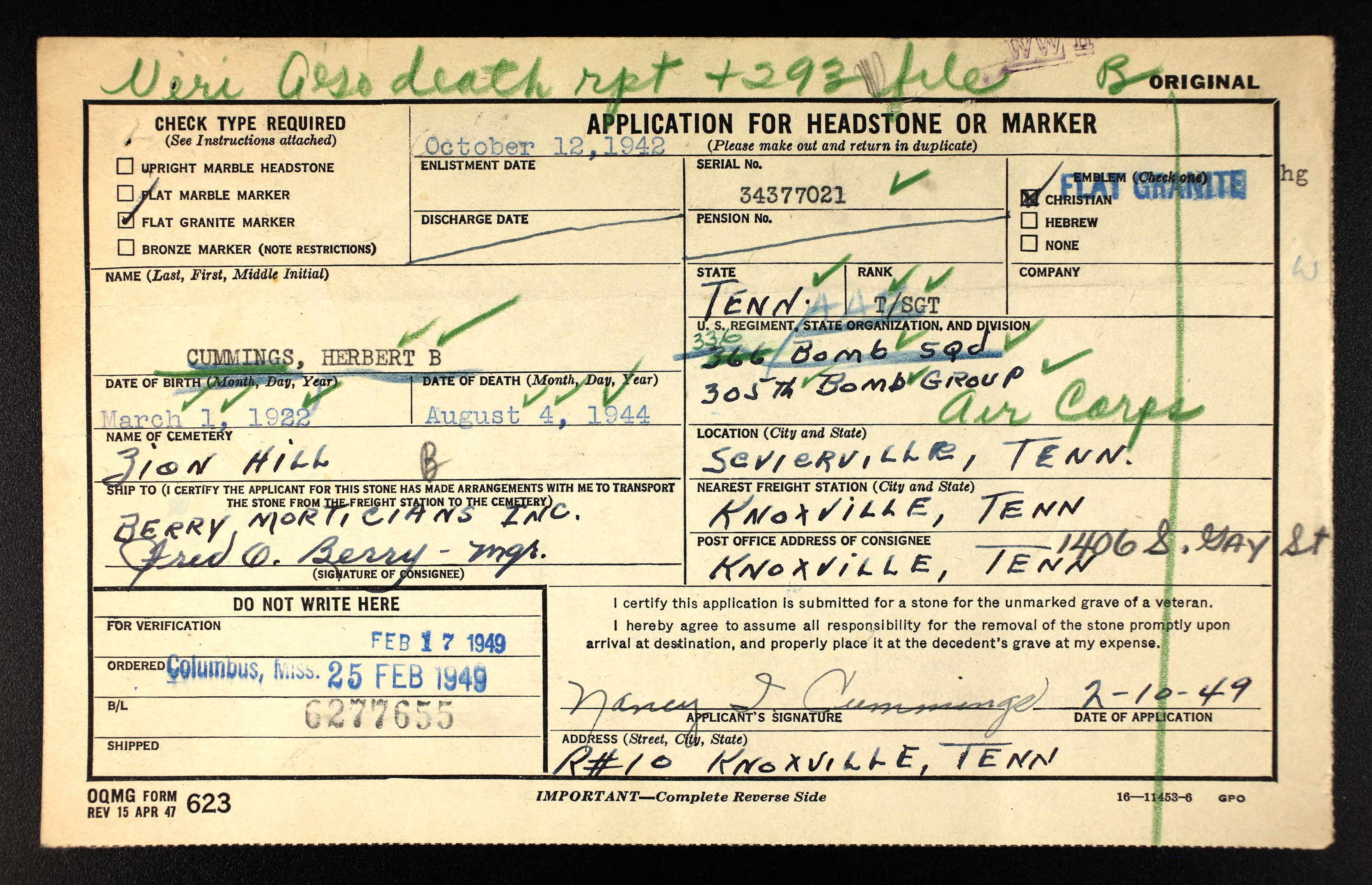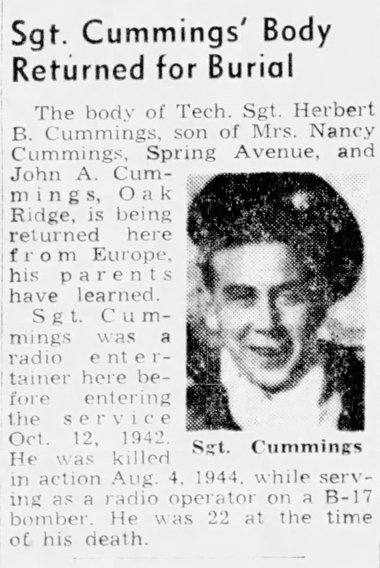 TSgt. Herbert B. Cummings was repatriated back to the United States after the war and funeral services were held January 23,1949, at Zion Hill Baptist Church. Buried in Zion Hill Cemetery, Sevier County, TN.