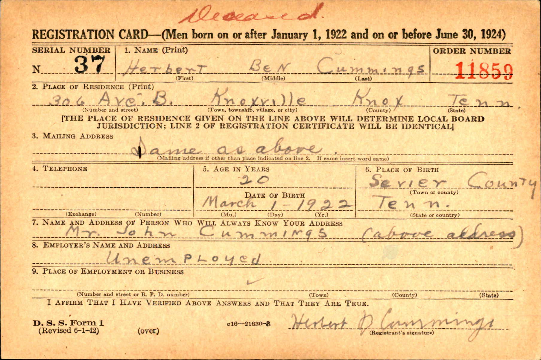 Herbert Ben Cummings was born in Sevier County, Tennessee, the son of John Alexander Cummings and Nancy Hale. Siblings: Harlen Cummings, Herman Cummings, and Georgie Cummings.