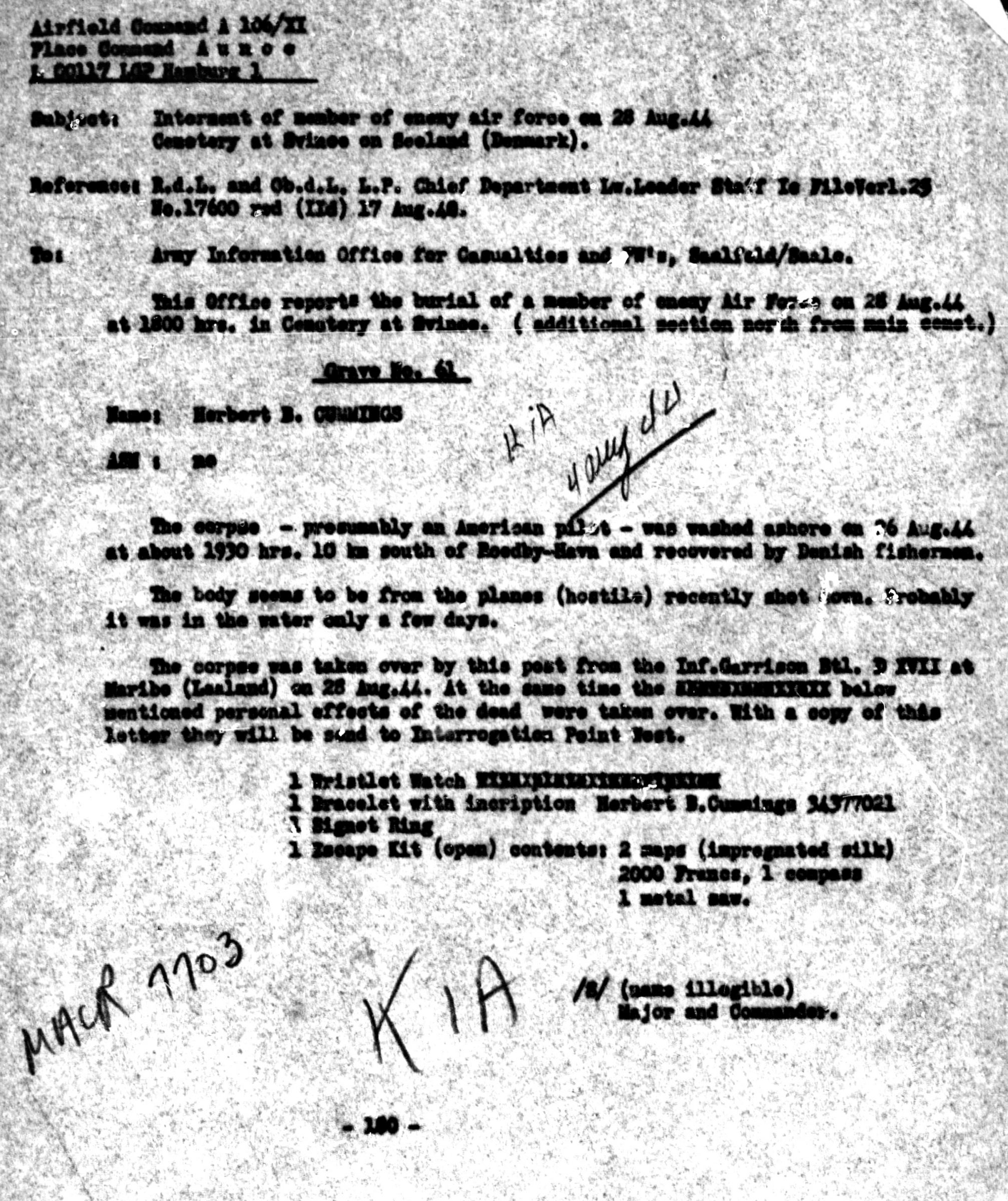 Aircraft B-17G with serial number 42-107105 departed from Chelveston in England in a Heavy bombing mission. The aircraft crashed 4 km south of Gedser (Denmark) over the sea. Herbert B. Cummings was washed ashore on 26 August 1944 at about 1930 hours, 10 km south of Roedby-Havn and was recovered by Danish fisherman. He was initially buried on a Cemetery on Seeland in Denmark.