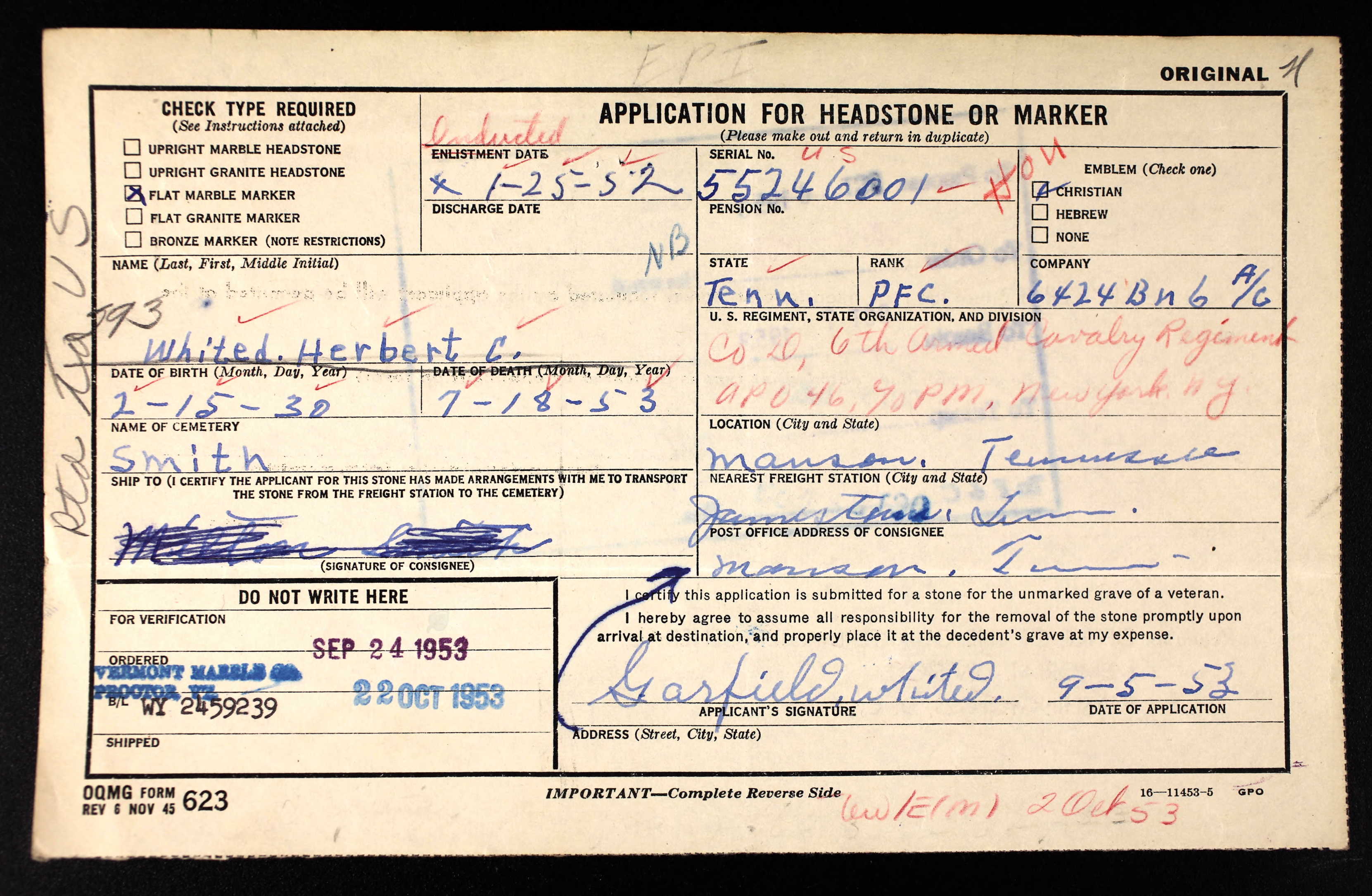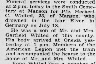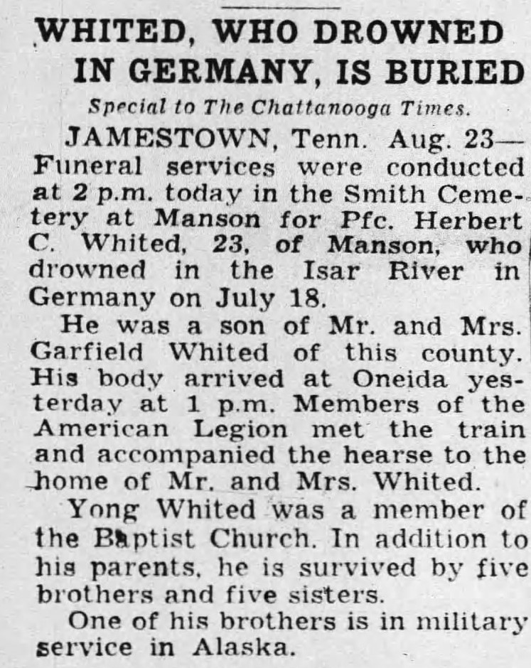 Jamestown, Tenn. Aug. 23 – Funeral services were conducted at the Smith Cemetery at Manson for Pfc. Herbert C. Whited, 23, of Manson, who drowned in the Isar River in Germany on July 18. He was the son of Mr. and Mrs. Garfield Whited of this county. His body arrived at Oneida yesterday. Member of the American Legion met the train and accompanied the hearse to the home of Mr. and Mrs. Whited. Young Whited was a member of the Baptist Church. In addtion to his parents, he is survived by five brothers and five sisters. One of his brothers is in military service in Alaska.