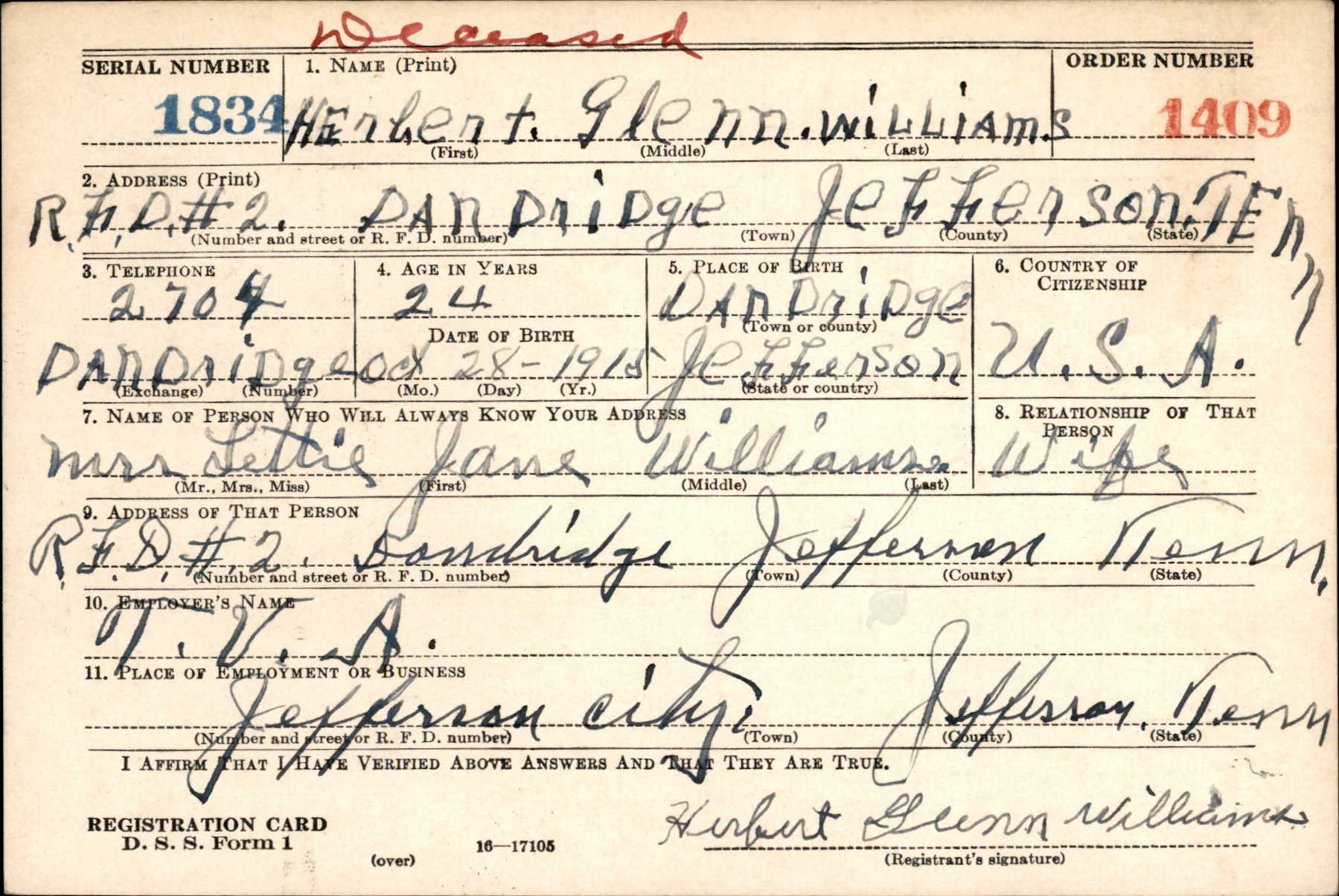 Herbert Glenn Williams was born at Dandridge, Tennessee, the son of Decatur G. Williams and Viola Burchfiel. He married Lettie Jane Henderson on 30 March 1935 in Jefferson, Tn.