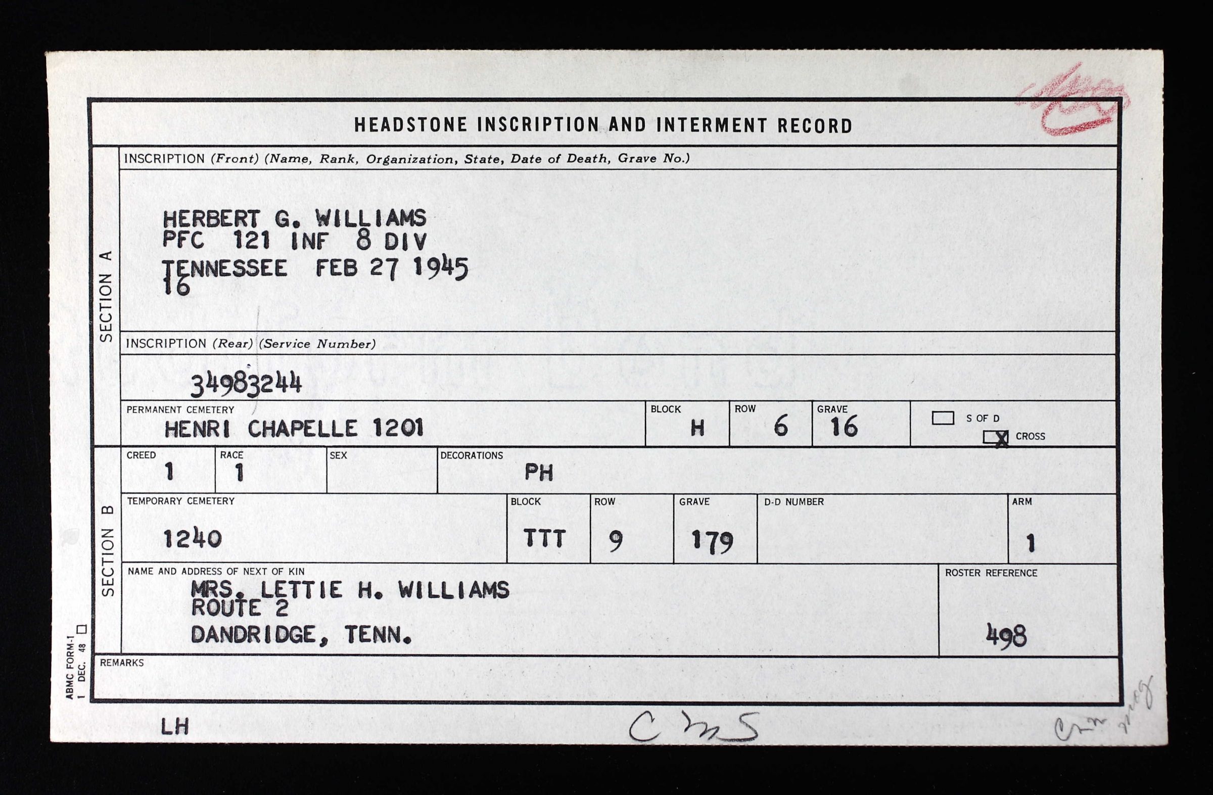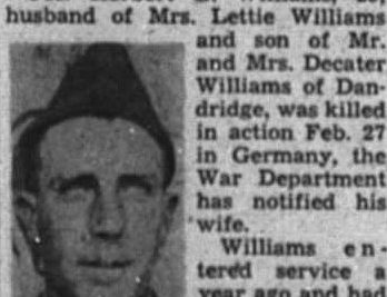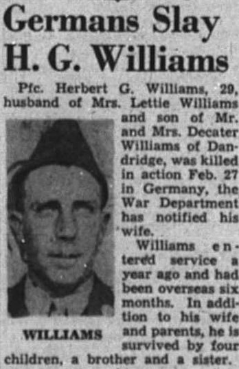 Pfc. Herbert G. Williams, 29, husband of Mrs. Lettie Williams and son of Mr. and Mrs. Decater Williams of Dandridge, was killed in action Feb. 27 in Germany, the War Department has notified his wife. Williams entered service a year ago and had been overseas six months. In addition to his wife and parents, he is survived by four children, a brother and a sister.