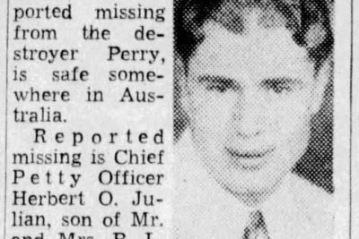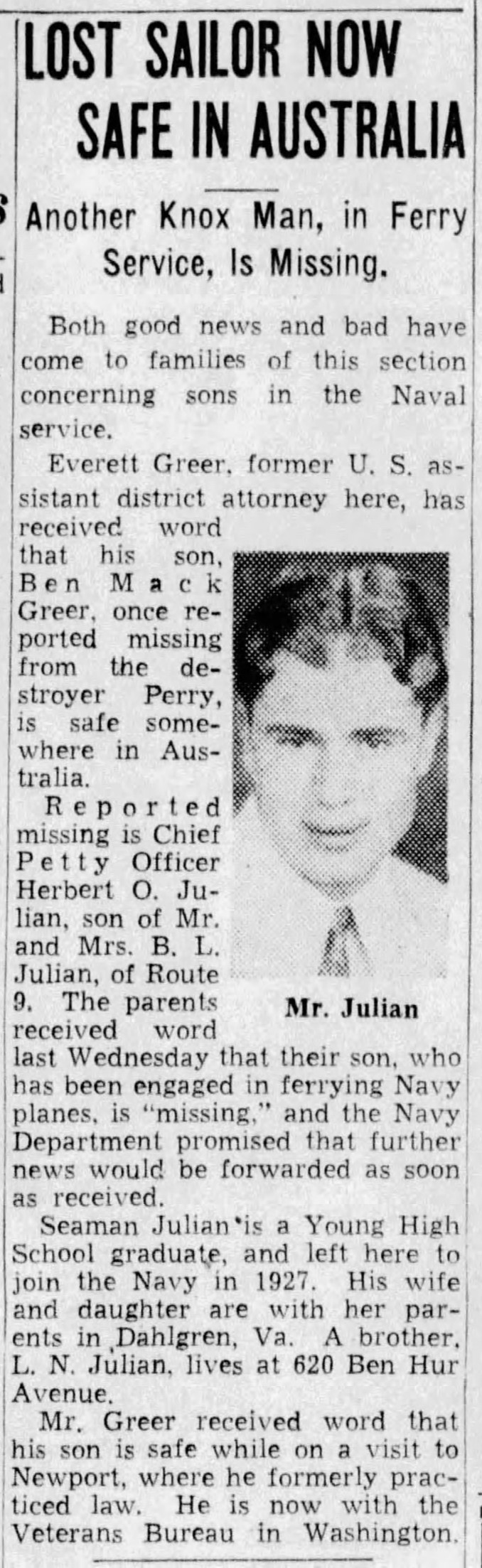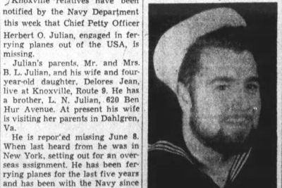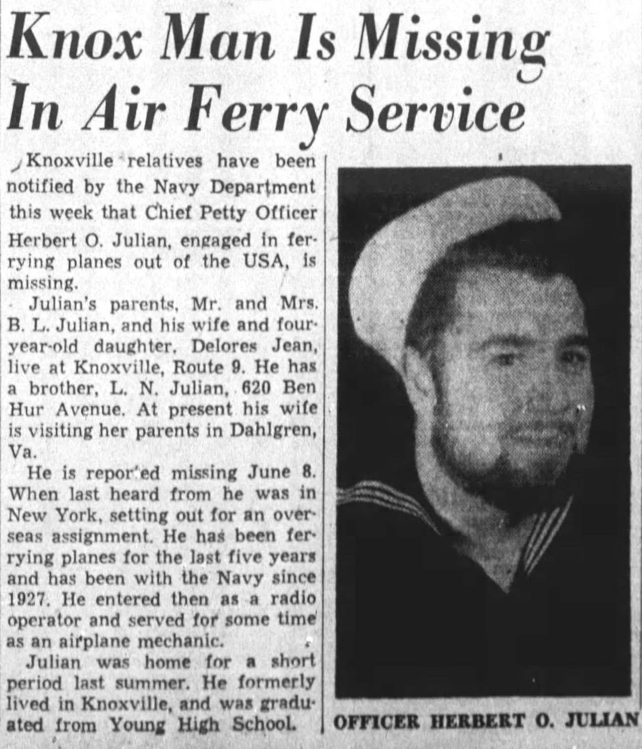 Knoxville relatives have been notified by the Navy Department this week that Chief Petty Officer Herbert O. Julian, engaged in ferrying planes out of the USA, is missing. Julian’s parents, Mr. and Mrs. B.L. Julian, and his wife and four-year-old daughter Delores Jean, live at Knoxville, Route 9. He has a brother, L.N. Julian, 620 Ben Hur Avenue. At present his wife is visiting her parents in Dahlgren, Va. He is reported missing June 8. When last heard from he was in New York, setting out for an overseas assignment. He has been ferrying planes for the last five years and has been in the Navy since 1927. He entered then as a radio operator and served for some time as an airplane mechanic. Julian was home for a short period last summer. He formerly lived in Knoxville, and was graduated from Young High School.