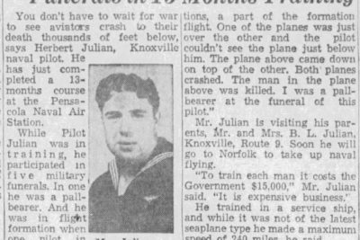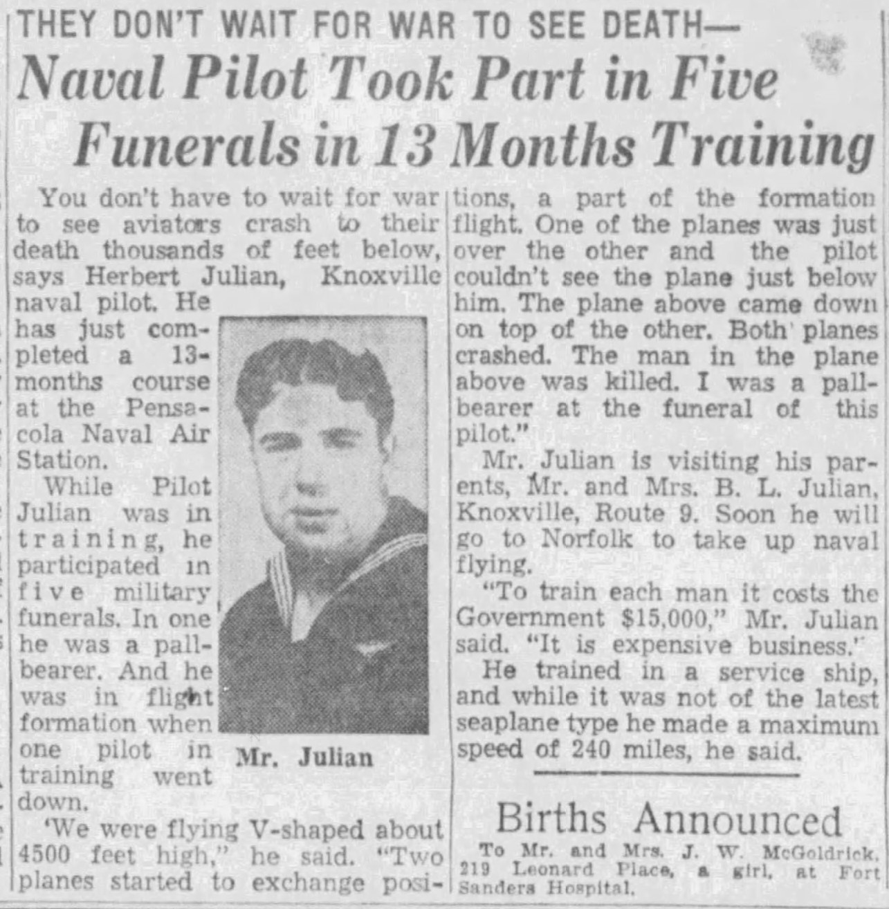 You don’t have to wait for war to see aviators crash to their death thousands of feet below, says Herbert Julian, Knoxville naval pilot. He has just completed a 13-months course at the Pensacola Naval Air Station. While Pilot Julian was in training, he participated in five military funerals. In one he was a pallbearer. And he was in flight formation when one pilot in training went down. ‘We were flying V-shaped about 4500 feet high,” he said. “Two planes started to exchange positions, a part of the formation flight. One of the planes was just over the other and the pilot couldn’t see the plane just below him. The plane above came down on top of the other. Both planes crashed. The man in the plane above was killed. I was a pallbearer at the funeral of this pilot.” Mr. Julian is visiting his parents, Mr. and Mrs. B.L. Julian, Knoxville, Route 9. Soon he will go to Norfolk to take up naval flying.