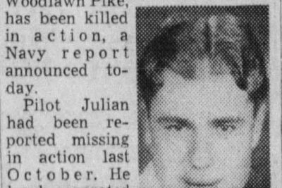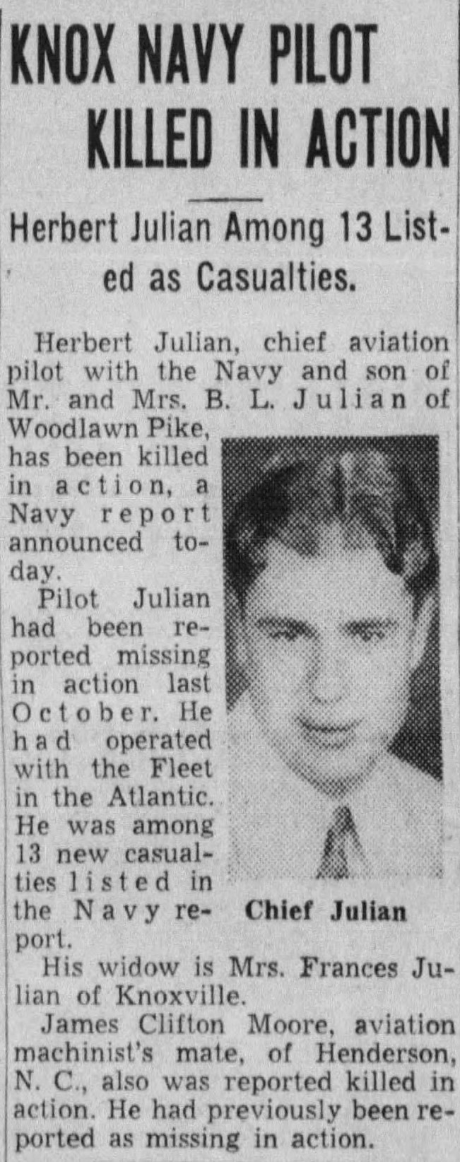 Herbert Julian, chief aviation pilot with the Navy and son of Mr. and Mrs. B.L. Julian of Woodlawn Pike, has been killed in action, a Navy report announced today. Pilot Julian had been reported missing in action last October. He had operated with the Fleet in the Atlantic. He was among 13 new casualties listed in the Navy report. His widow is Mrs. Frances Julian of Knoxville.