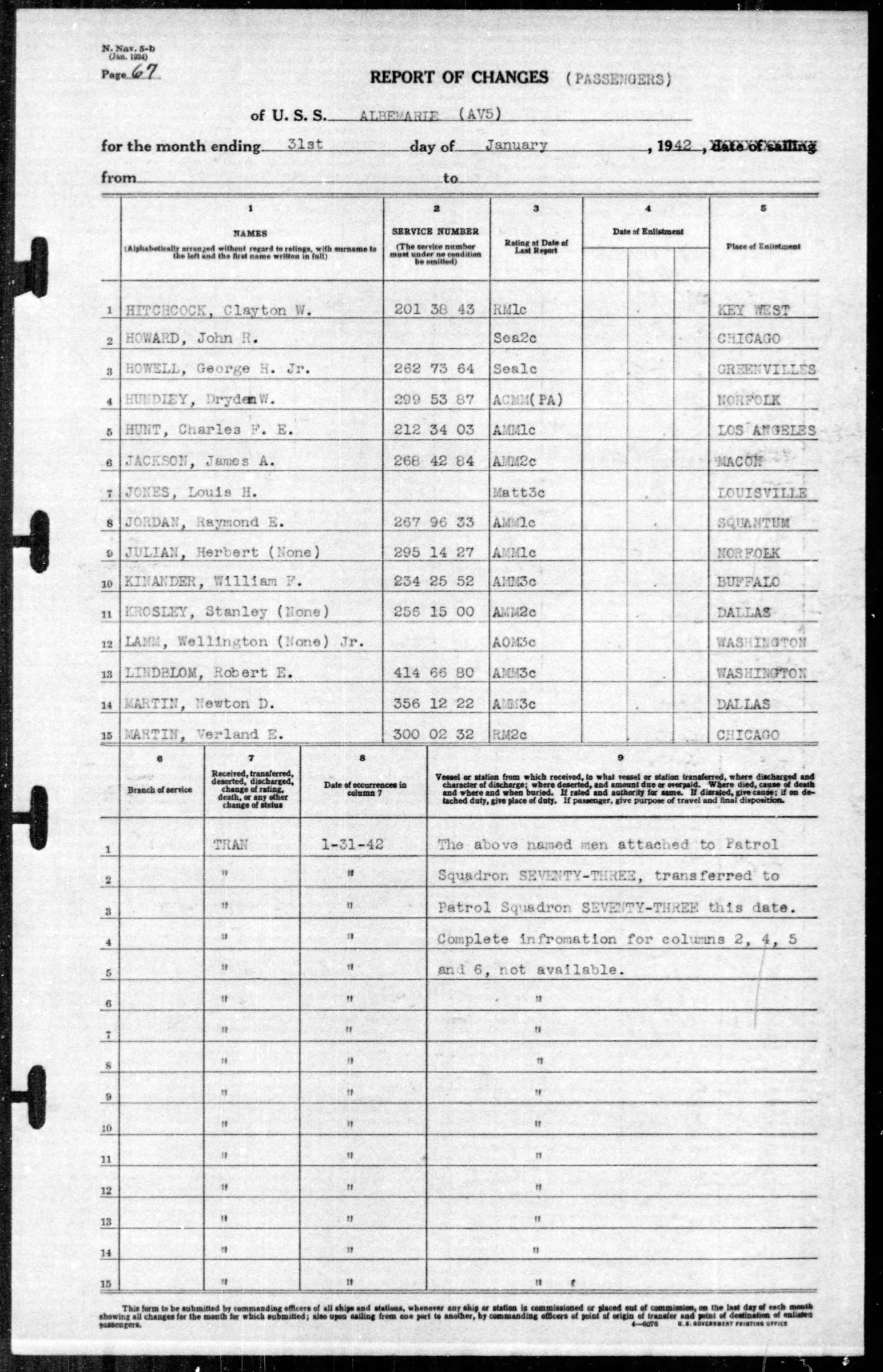 On 31 January 1942 Herbert Julian was transferred and attached to Patrol Squadron 73. Passenger on the U.S.S. Albemarie (AV5).
