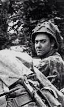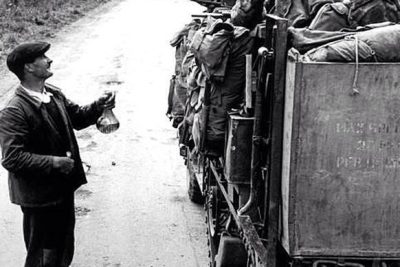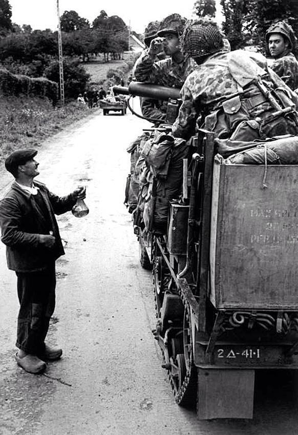 Jules Lecoeur offers calvados [a strong apple-based drink) to members of B Company 41st AIR. On the 29th June 1944, upper right facing the camera, is Sgt Herbert W. Tennyson; he was killed less than two weeks later due to friendly fire from members of the 30th Infantry Division near Domfront, France. The photo was taken by Robert Capa. Location of the photo is D51 road north of Hambye.